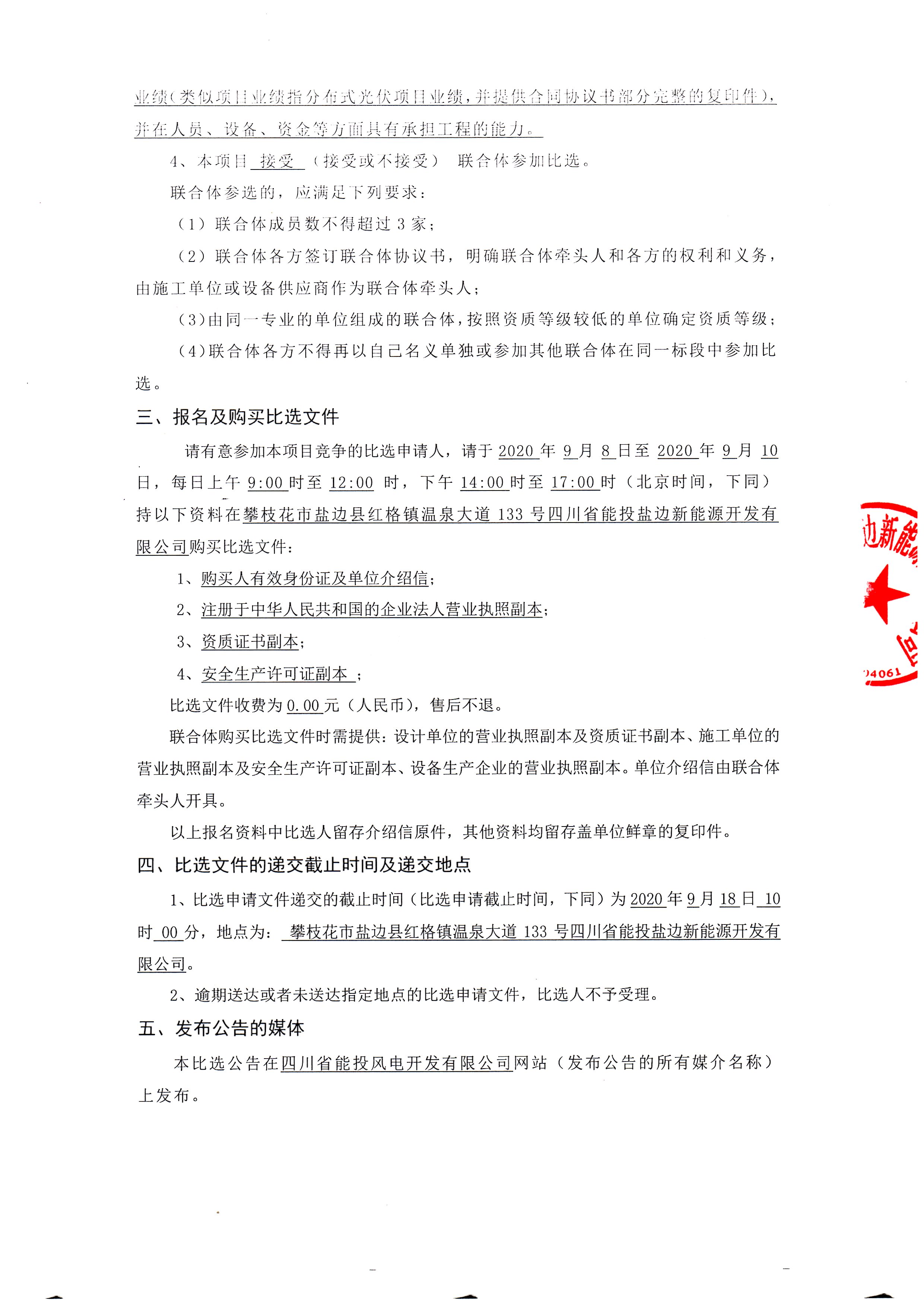 请有意参加本项目竞争的比选申请人,请于2020年9月14日至2020年9月17日,每日上午9:00时至12:00 时,下午14:00时至17:00时(北京时间,下同)持以下资料在攀枝花市盐边县红格镇温泉大道133号四川省能投盐边新能源开发有限公司购买比选文件: