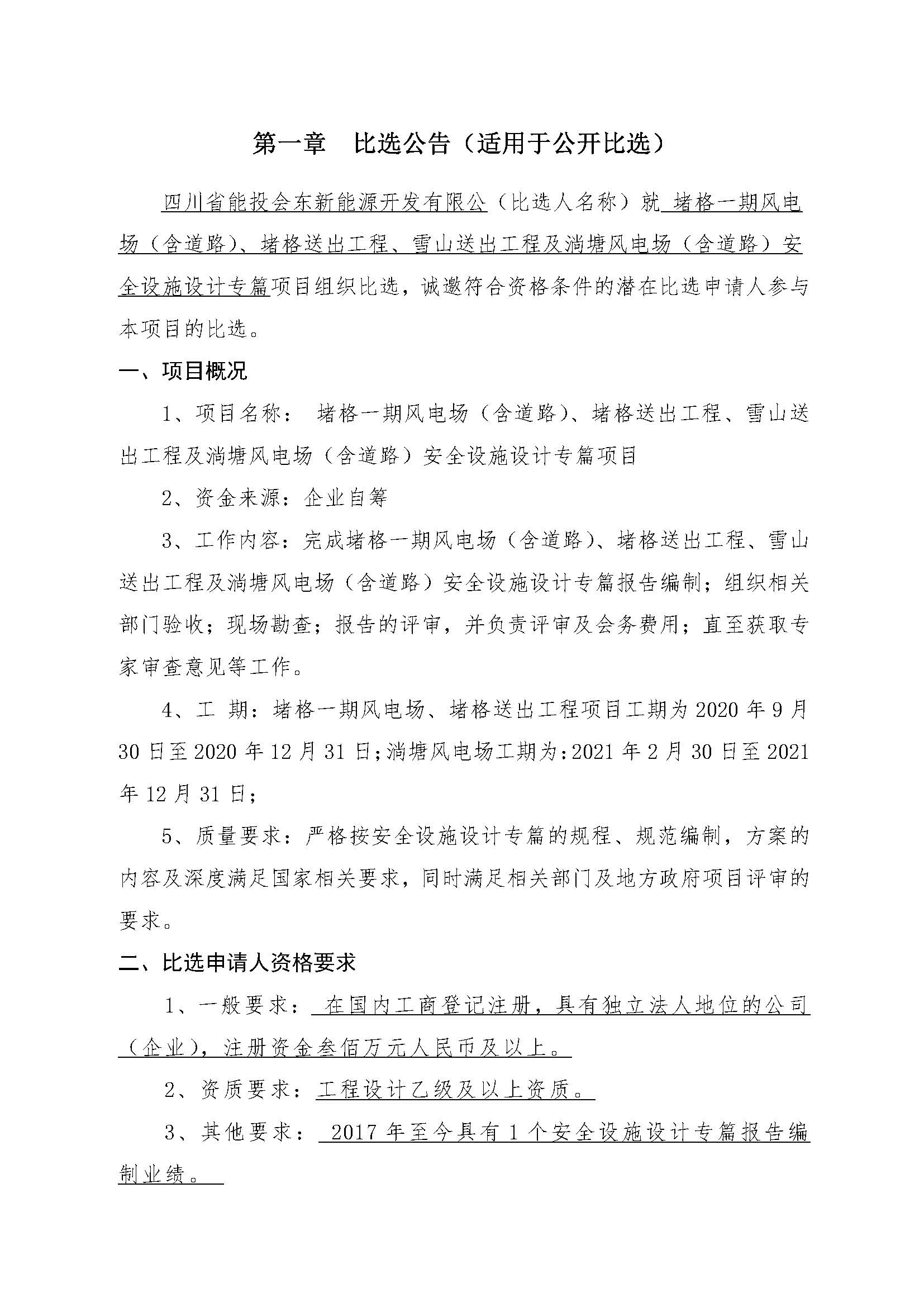 四川省能投会东新能源开发有限公(比选人名称)就 堵格一期风电场(含道路)、堵格送出工程、雪山送出工程及淌塘风电场(含道路)安全设施设计专篇项目组织比选,诚邀符合资格条件的潜在比选申请人参与本项目的比选。