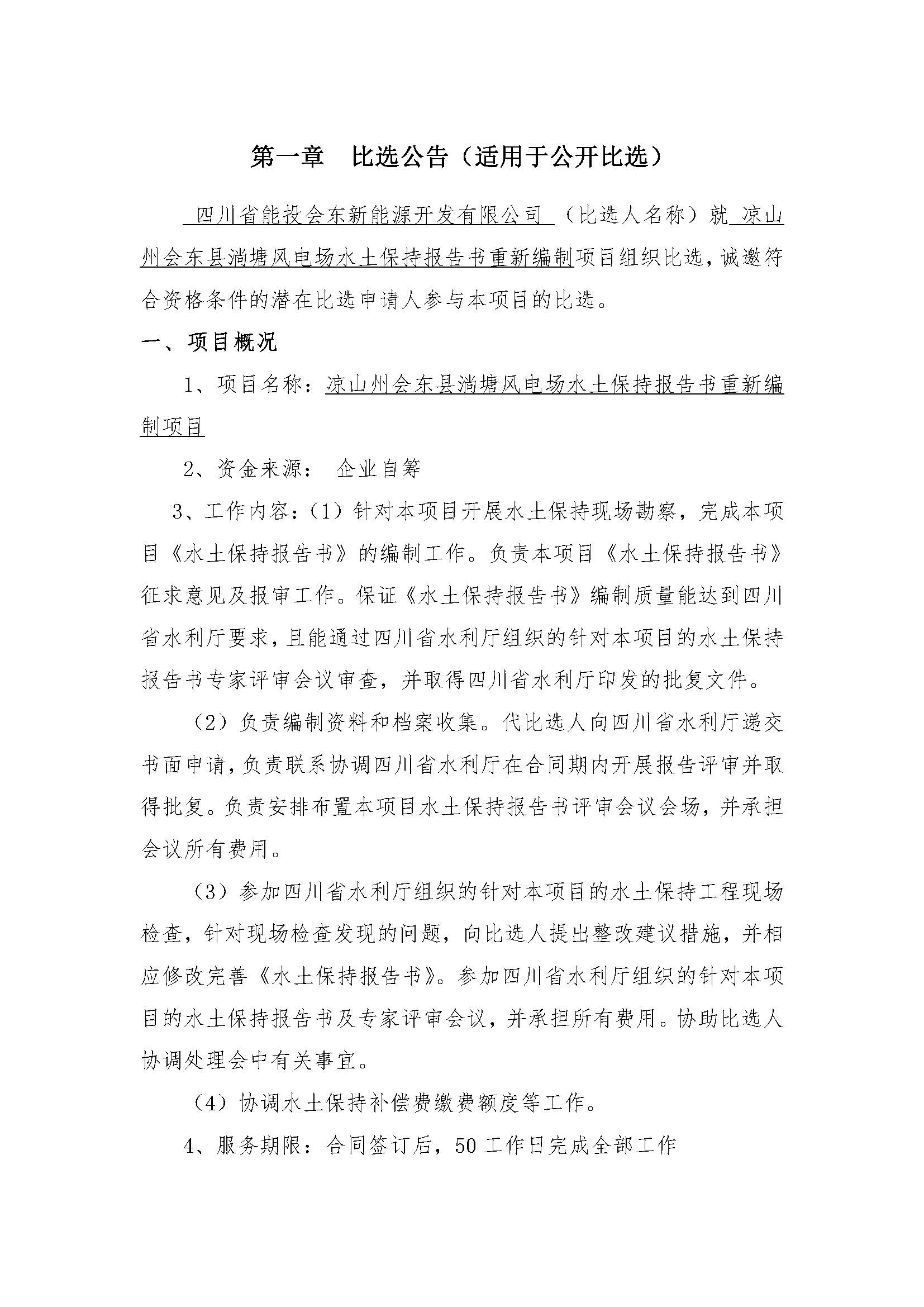 四川省能投会东新能源开发有限公司 (比选人名称)就 凉山州会东县淌塘风电场水土保持报告书重新编制项目组织比选,诚邀符合资格条件的潜在比选申请人参与本项目的比选。