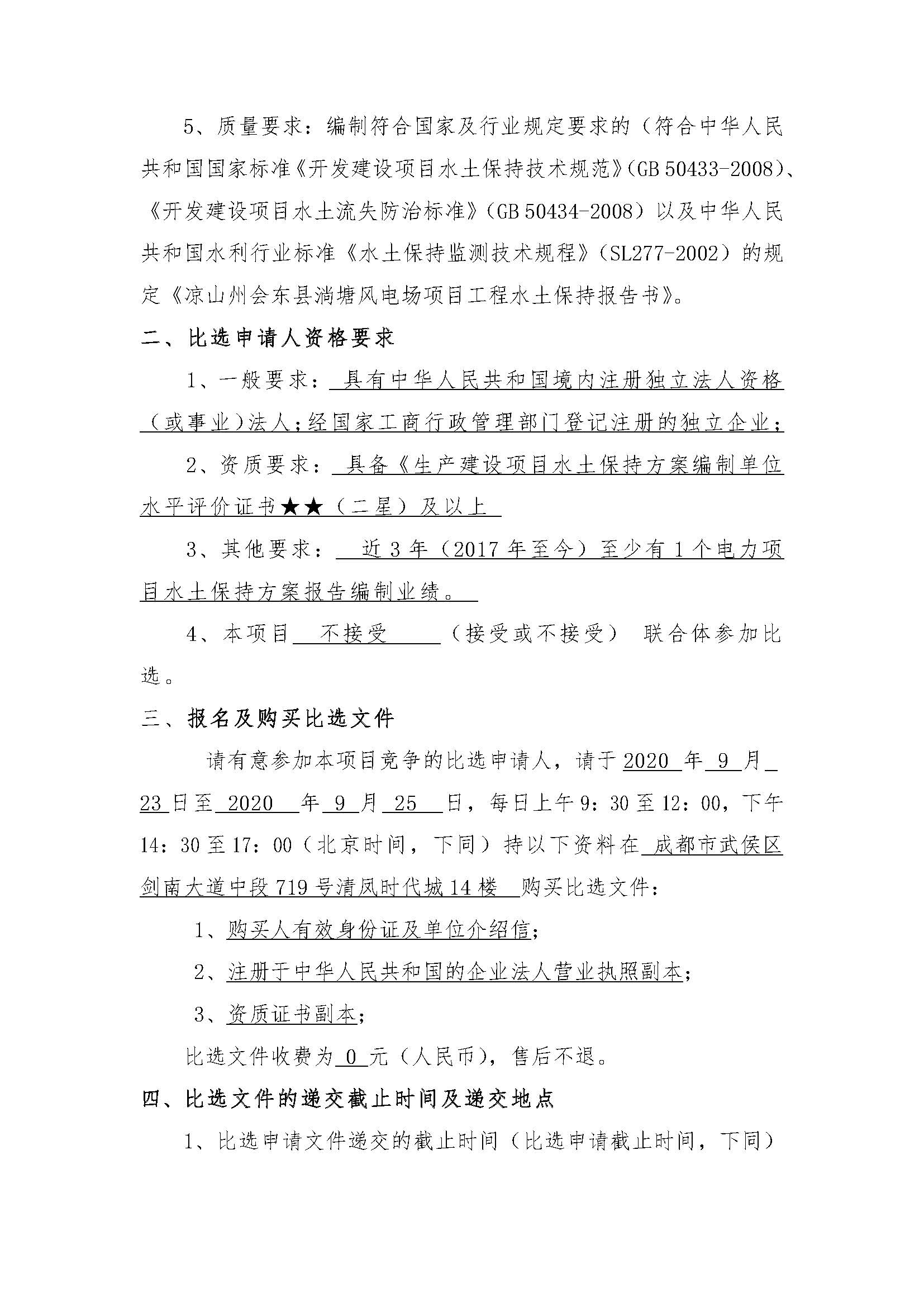 5、质量要求:编制符合国家及行业规定要求的(符合中华人民共和国国家标准《开发建设项目水土保持技术规范》(GB 50433-2008)、《开发建设项目水土流失防治标准》(GB 50434-2008)以及中华人民共和国水利行业标准《水土保持监测技术规程》(SL277-2002)的规定《凉山州会东县淌塘风电场项目工程水土保持报告书》。