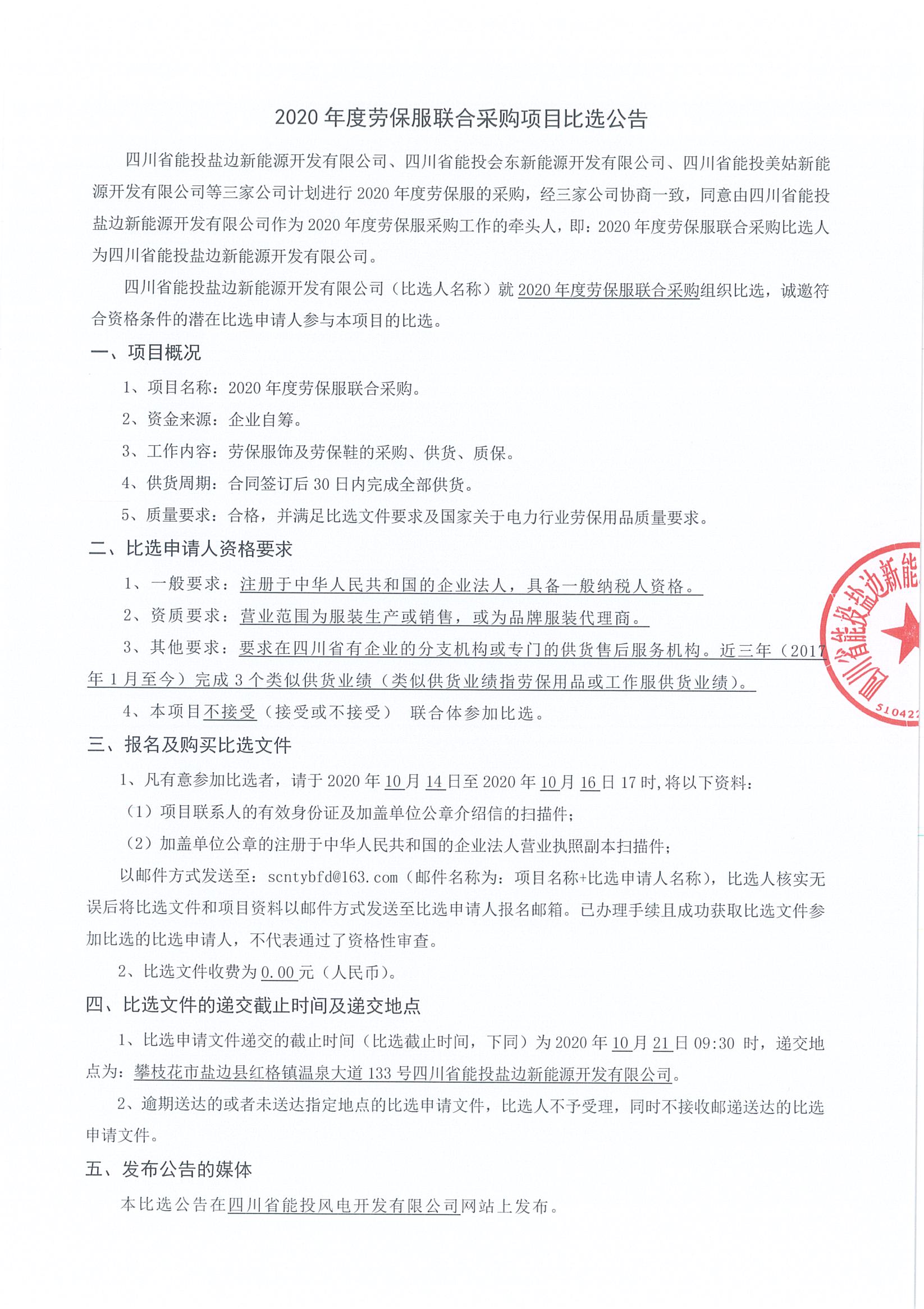 四川省能投盐边新能源开发有限公司(比选人名称)就2020年度劳保服联合采购组织比选,诚邀符合资格条件的潜在比选申请人参与本项目的比选。