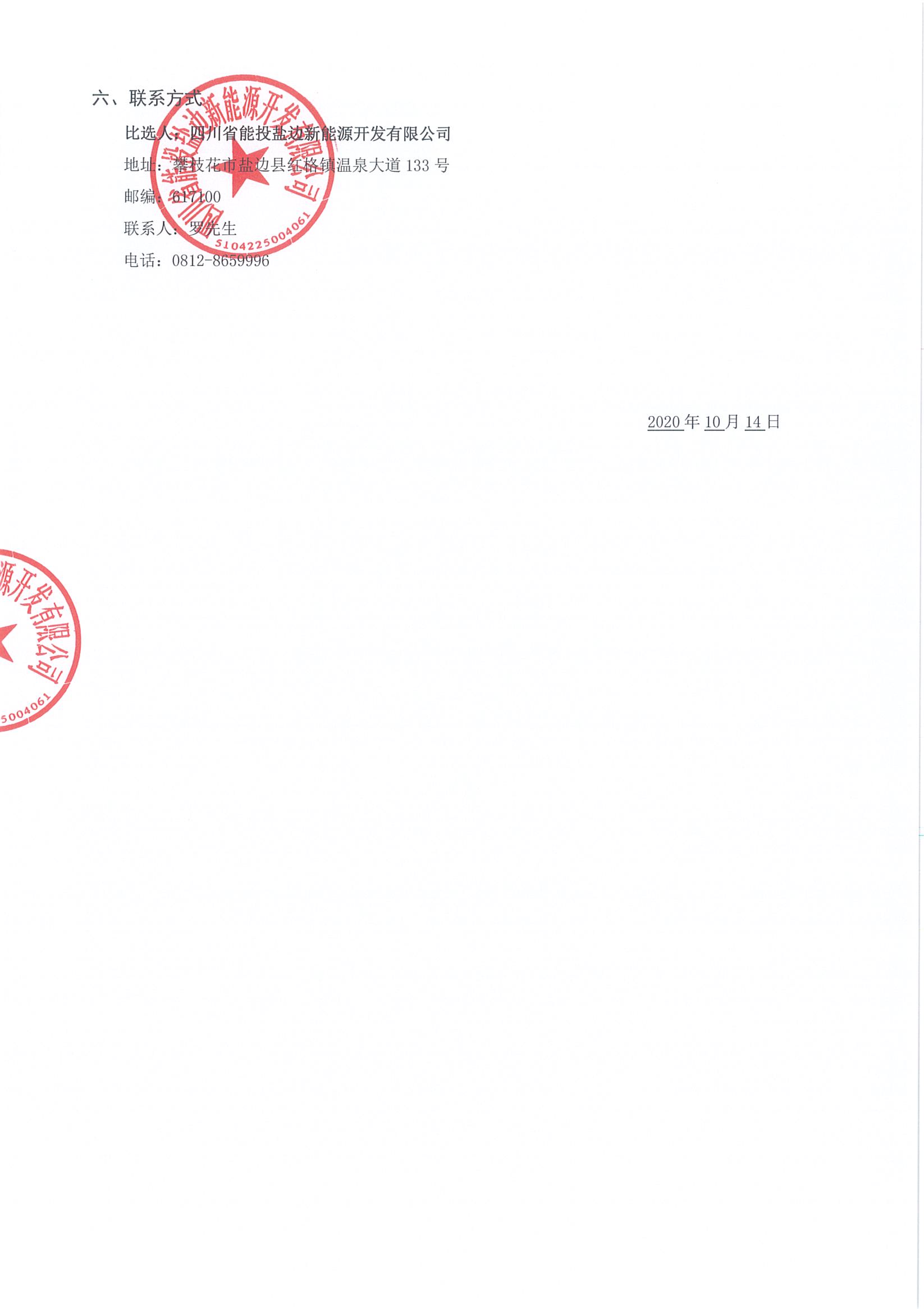 1、比选申请文件递交的截止时间(比选截止时间,下同)为2020年10月21日09:30 时,递交地点为:攀枝花市盐边县红格镇温泉大道133号四川省能投盐边新能源开发有限公司。