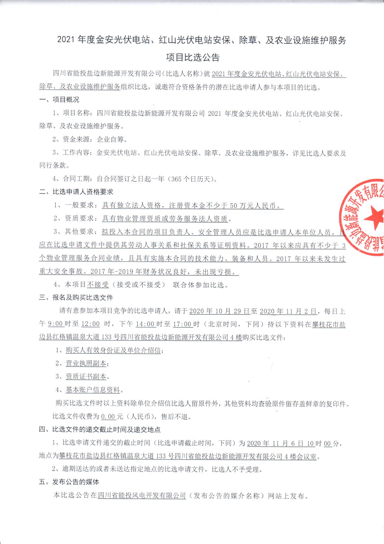 四川省能投盐边新能源开发有限公司(比选人名称)就2021年度金安光伏电站、红山光伏电站安保、除草、及农业设施维护服务组织比选,诚邀符合资格条件的潜在比选申请人参与本项目的比选。