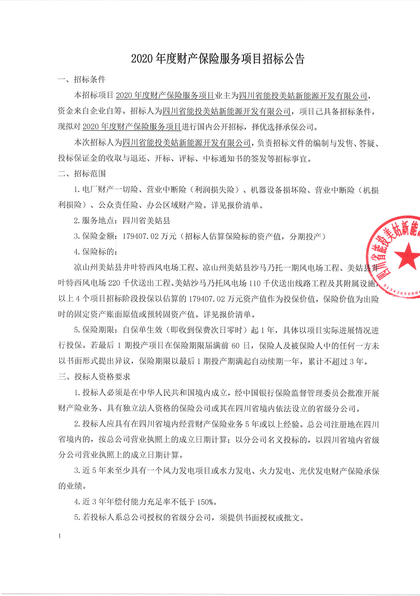 本招标项目2020年度财产保险服务项目业主为四川省能投美姑新能源开发有限公司,资金来自企业自筹。招标人为四川省能投美姑新能源开发有限公司,项目己具备招标条件,现拟对2020年度财产保险服务项目进行国内公开招标,择优选择承保公司。
