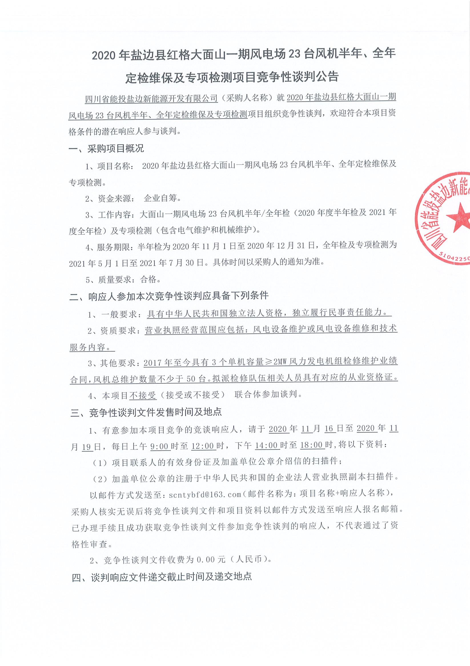 四川省能投盐边新能源开发有限公司(采购人名称)就2020年盐边县红格大面山一期风电场23台风机半年、全年定检维保及专项检测项目组织竞争性谈判,欢迎符合本项目资格条件的潜在响应人参与谈判。