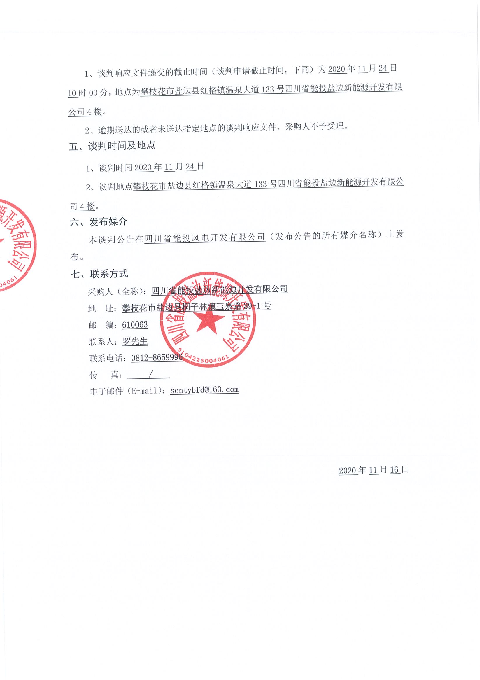 1、谈判响应文件递交的截止时间(谈判申请截止时间,下同)为2020年11月24日10时00分,地点为攀枝花市盐边县红格镇温泉大道133号四川省能投盐边新能源开发有限公司4楼。