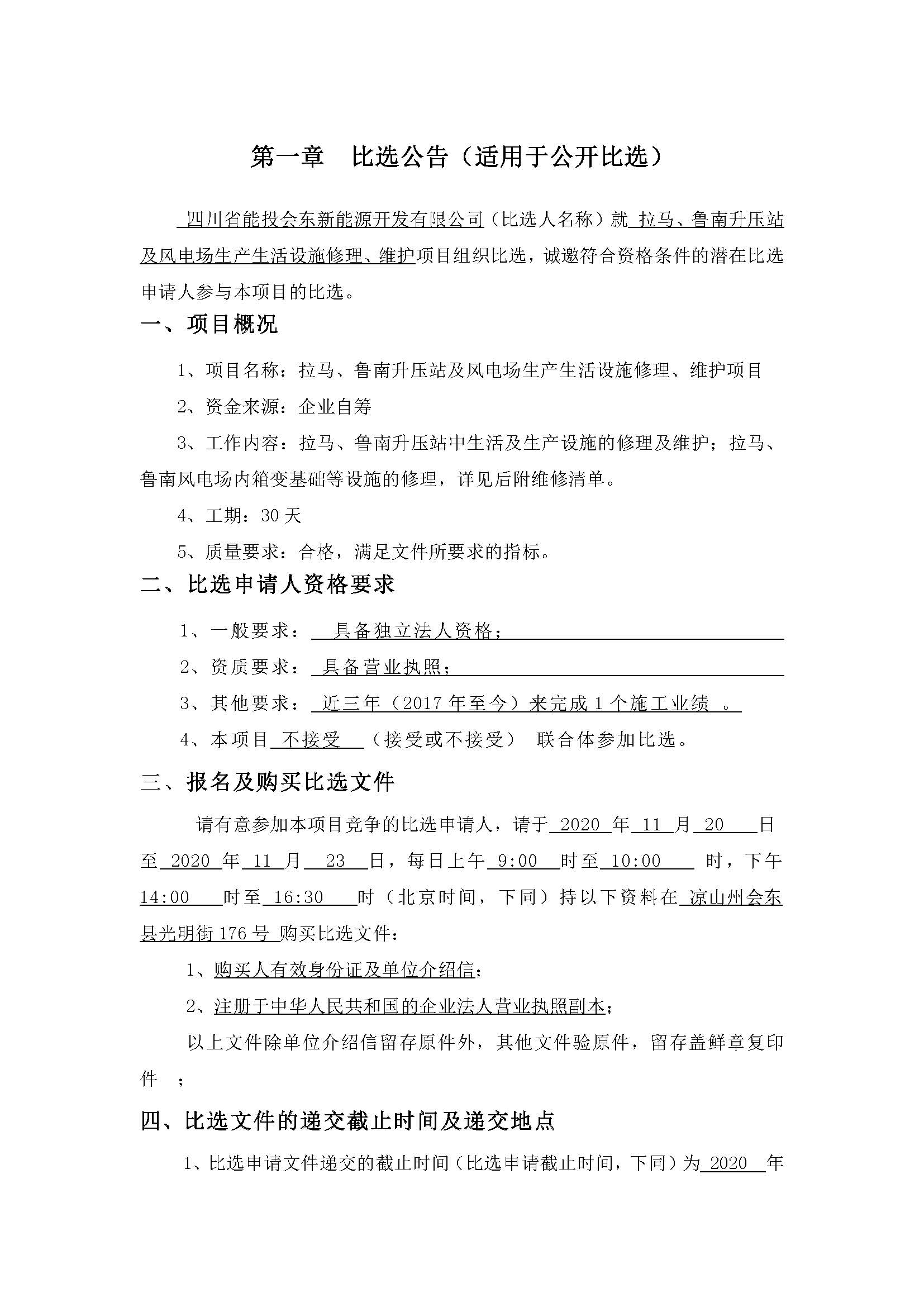 四川省能投会东新能源开发有限公司(比选人名称)就 拉马、鲁南升压站及风电场生产生活设施修理、维护项目组织比选,诚邀符合资格条件的潜在比选申请人参与本项目的比选。