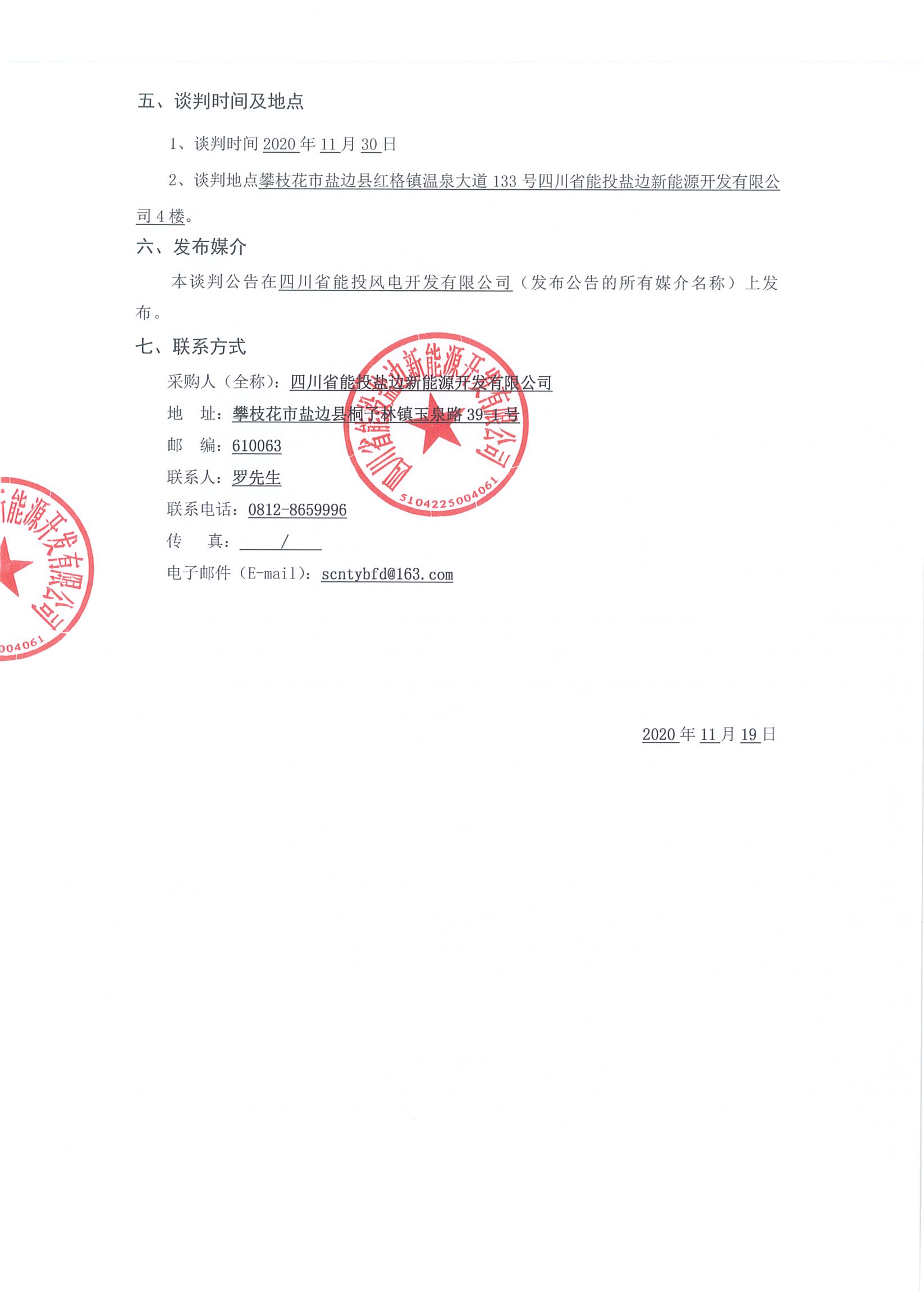 1、谈判响应文件递交的截止时间(谈判申请截止时间,下同)为2020年11月30日10时30分,地点为攀枝花市盐边县红格镇温泉大道133号四川省能投盐边新能源开发有限公司4楼。