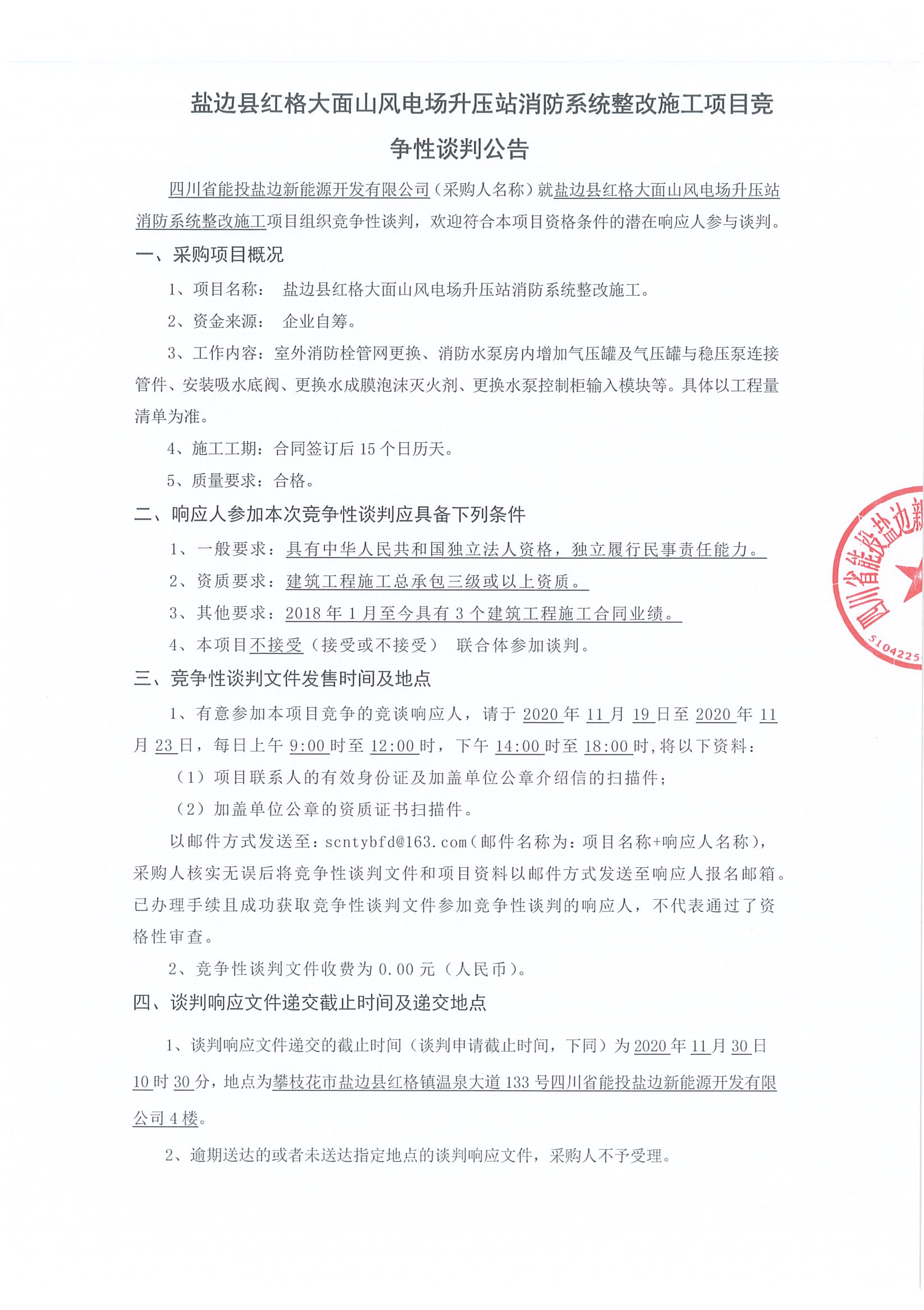 四川省能投盐边新能源开发有限公司(采购人名称)就盐边县红格大面山风电场升压站消防系统整改施工项目组织竞争性谈判,欢迎符合本项目资格条件的潜在响应人参与谈判。