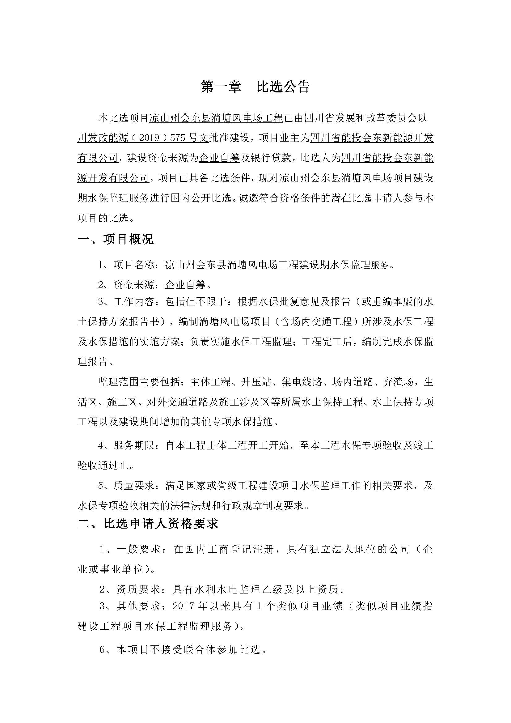 本比选项目凉山州会东县淌塘风电场工程已由四川省发展和改革委员会以川发改能源﹝2019﹞575号文批准建设,项目业主为四川省能投会东新能源开发有限公司,建设资金来源为企业自筹及银行贷款。比选人为四川省能投会东新能源开发有限公司。项目已具备比选条件,现对凉山州会东县淌塘风电场项目建设期水保监理服务进行国内公开比选。诚邀符合资格条件的潜在比选申请人参与本项目的比选。