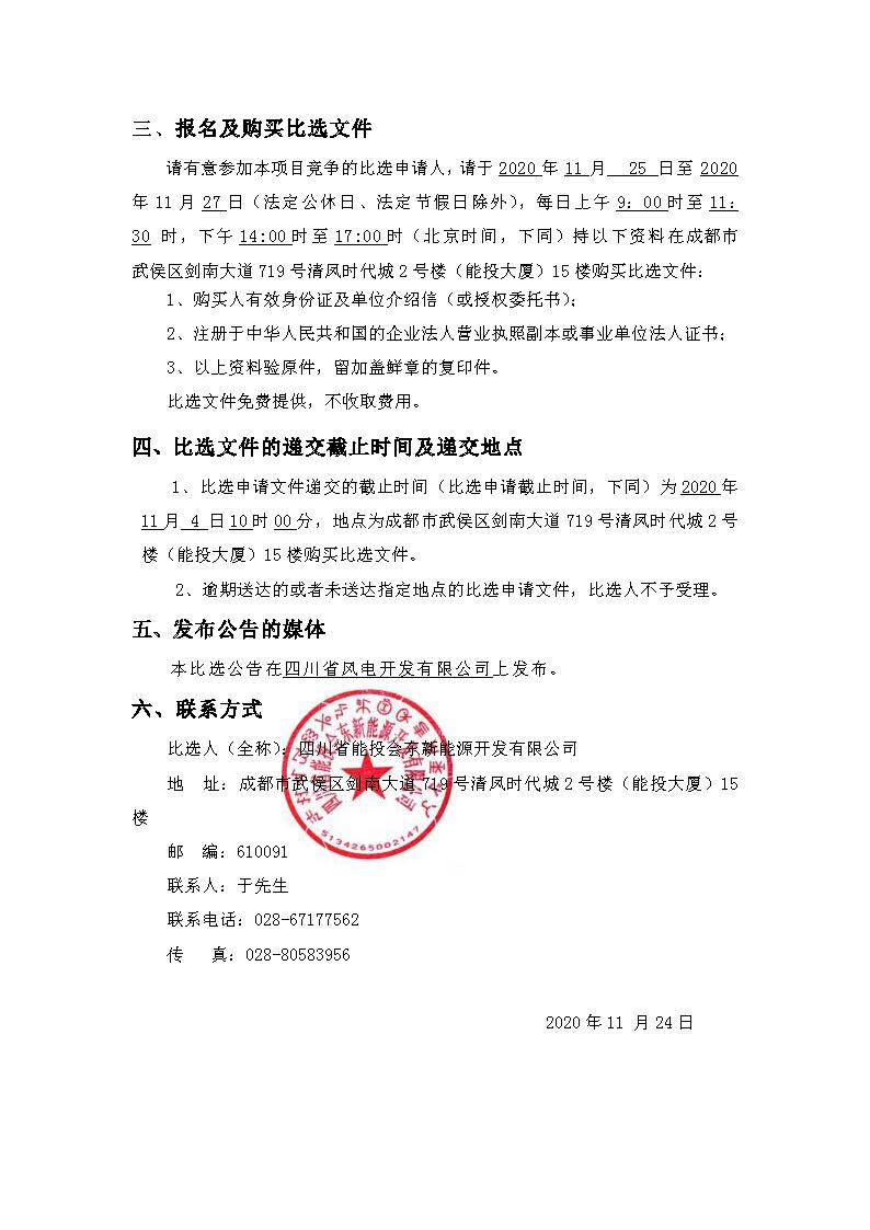 1、比选申请文件递交的截止时间(比选申请截止时间,下同)为2020年12月 4 日10时00分,地点为成都市武侯区剑南大道719号清凤时代城2号楼(能投大厦)15楼购买比选文件。
