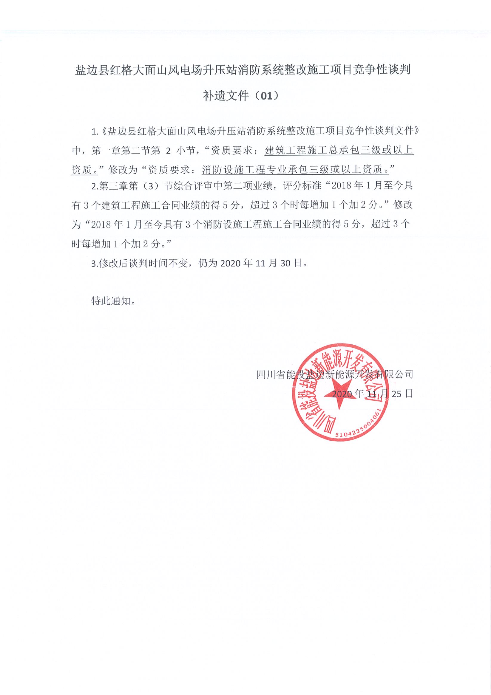1.《盐边县红格大面山风电场升压站消防系统整改施工项目竞争性谈判文件》中,第一章第二节第2小节,“资质要求:建筑工程施工总承包三级或以上资质。”修改为“资质要求:消防设施工程专业承包三级或以上资质。”