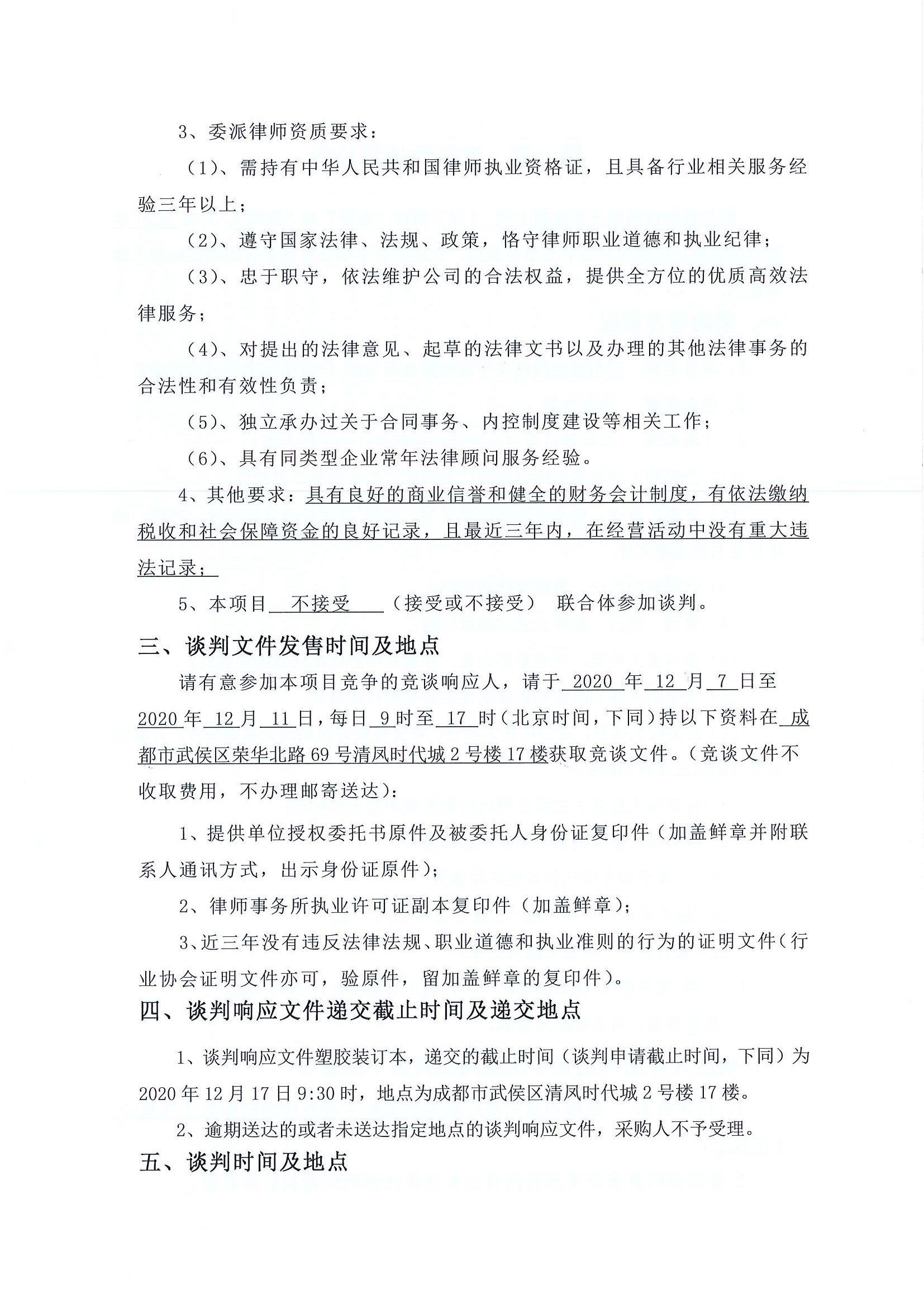 2、谈判地点 成都市武侯区荣华北路69号清凤时代城2号楼17楼1722。
