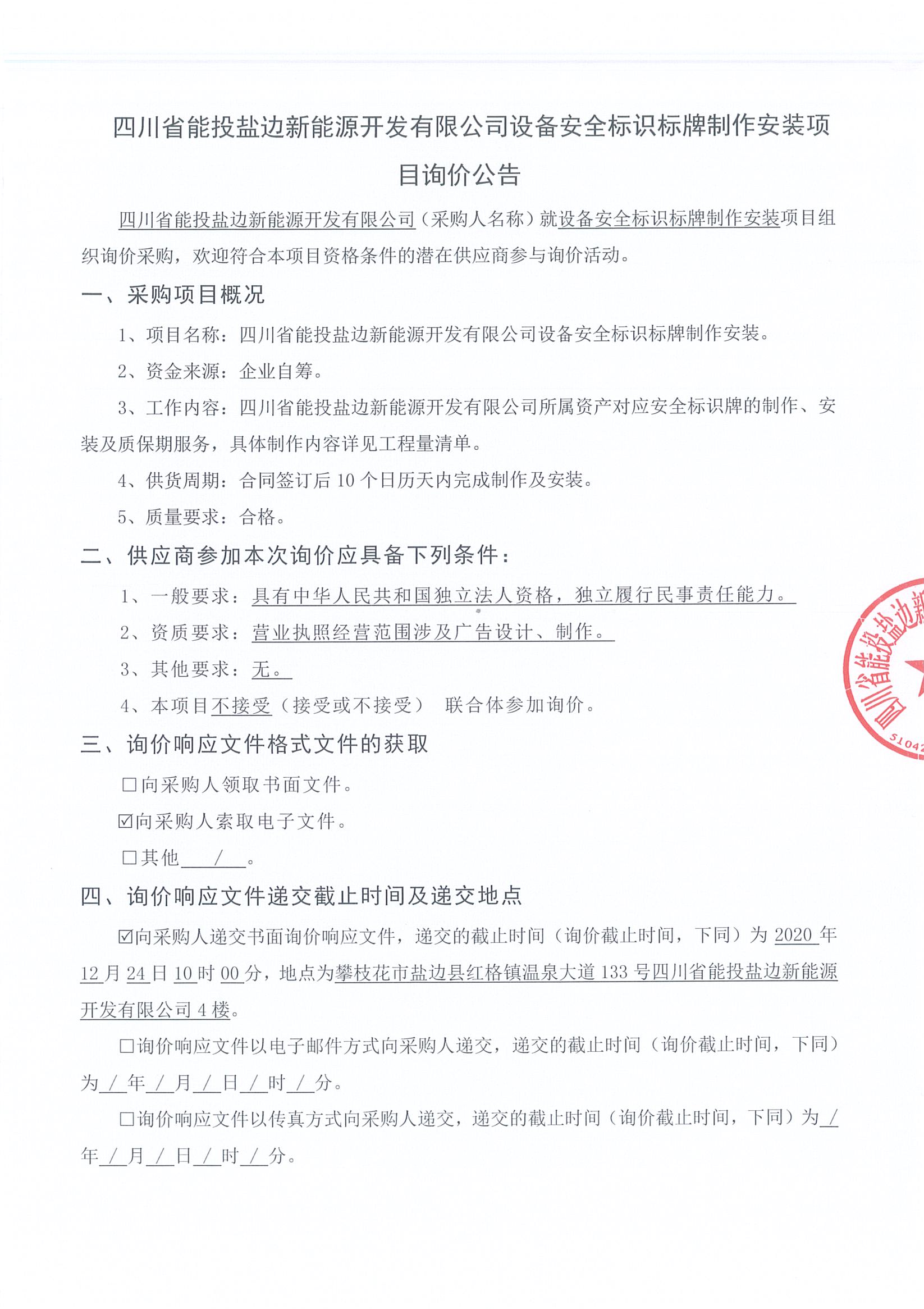 四川省能投盐边新能源开发有限公司(采购人名称)就设备安全标识标牌制作安装项目组织询价采购,欢迎符合本项目资格条件的潜在供应商参与询价活动。