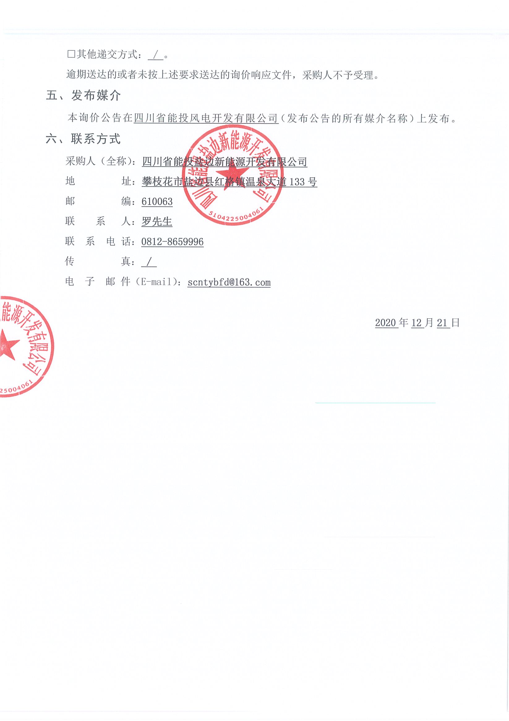 √向采购人递交书面询价响应文件,递交的截止时间(询价截止时间,下同)为2020年12月24日10时00分,地点为攀枝花市盐边县红格镇温泉大道133号四川省能投盐边新能源开发有限公司4楼。