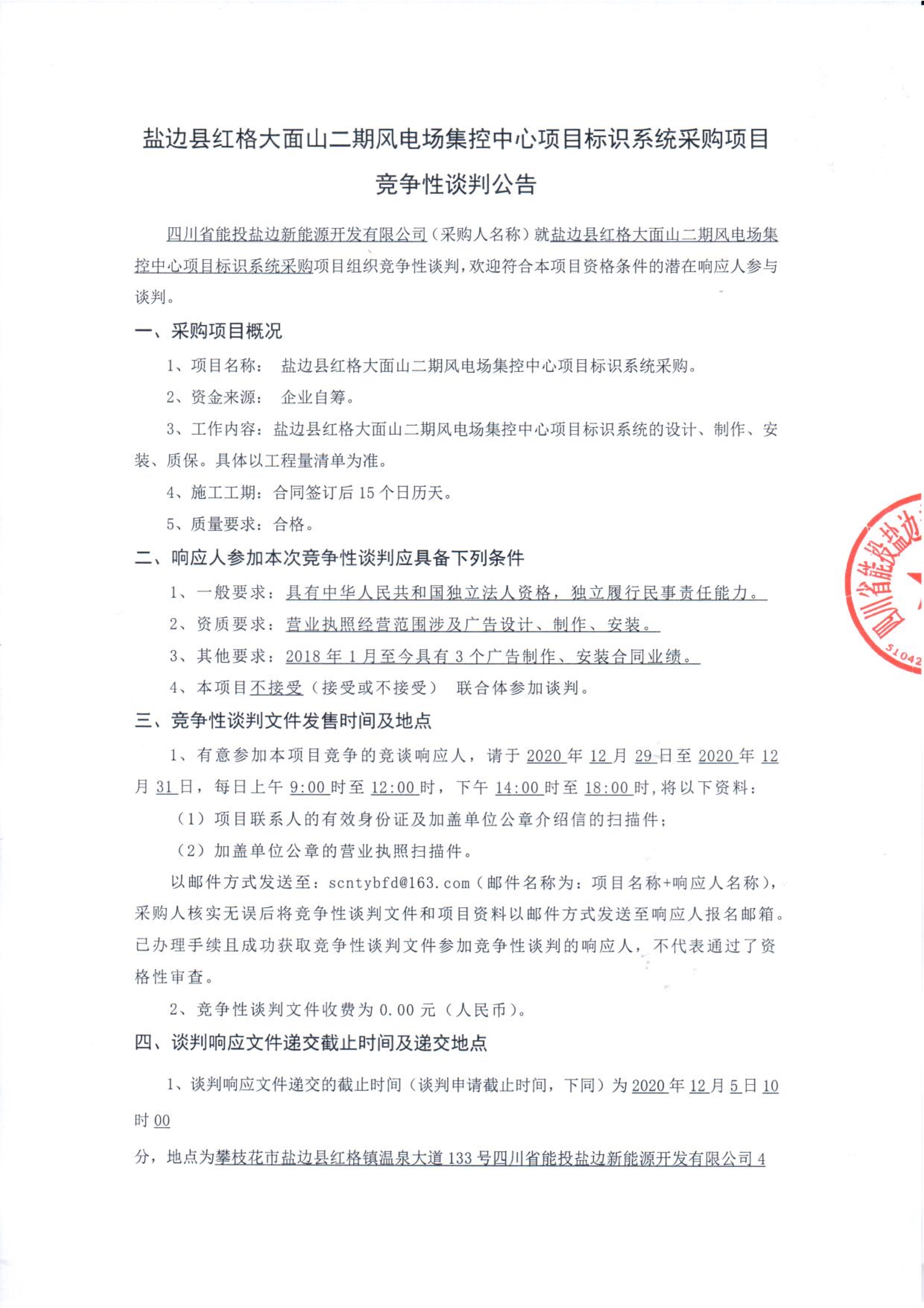 四川省能投盐边新能源开发有限公司(采购人名称)就盐边县红格大面山二期风电场集控中心项目标识系统采购项目组织竞争性谈判,欢迎符合本项目资格条件的潜在响应人参与谈判。
