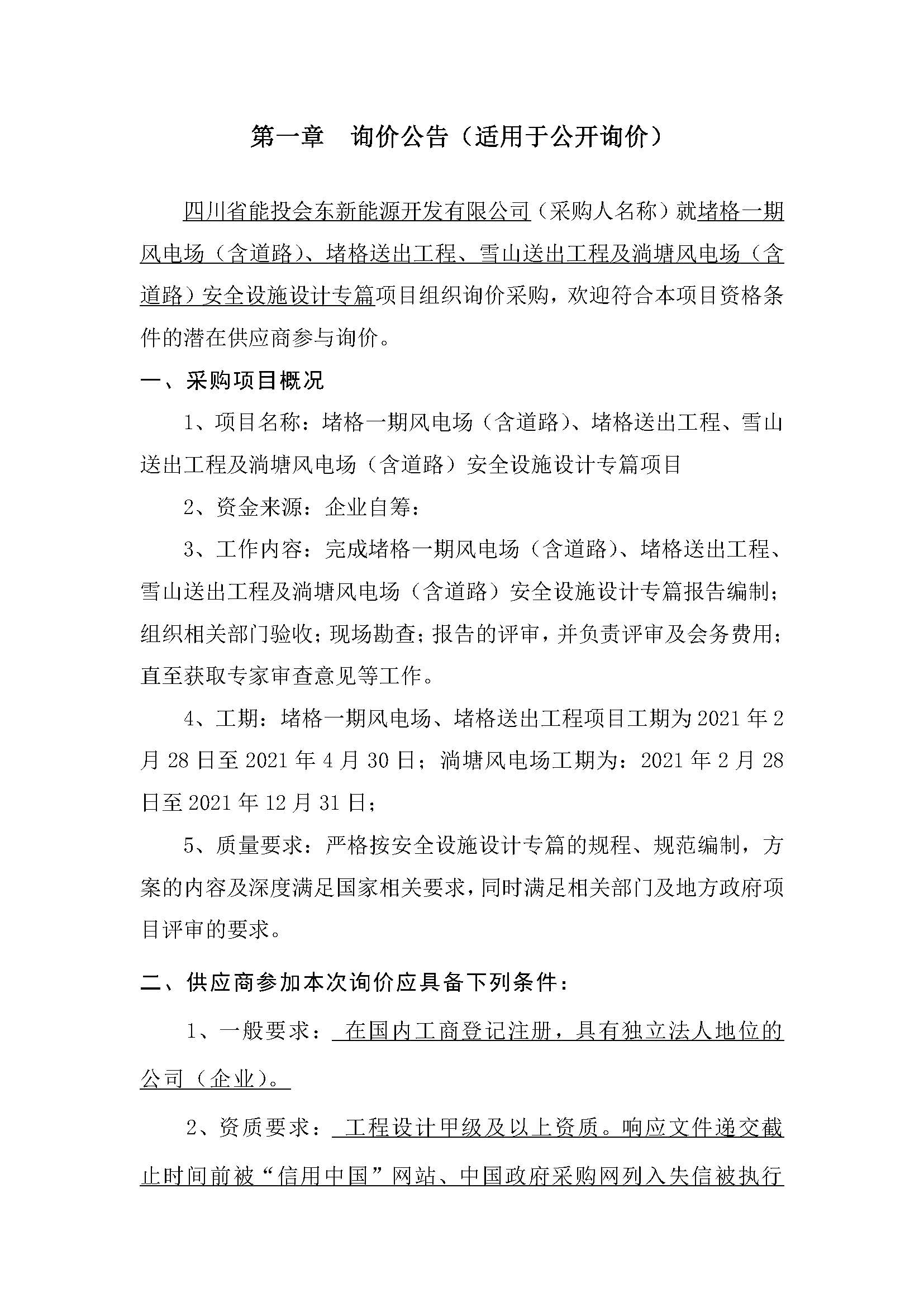 四川省能投会东新能源开发有限公司(采购人名称)就堵格一期风电场(含道路)、堵格送出工程、雪山送出工程及淌塘风电场(含道路)安全设施设计专篇项目组织询价采购,欢迎符合本项目资格条件的潜在供应商参与询价。