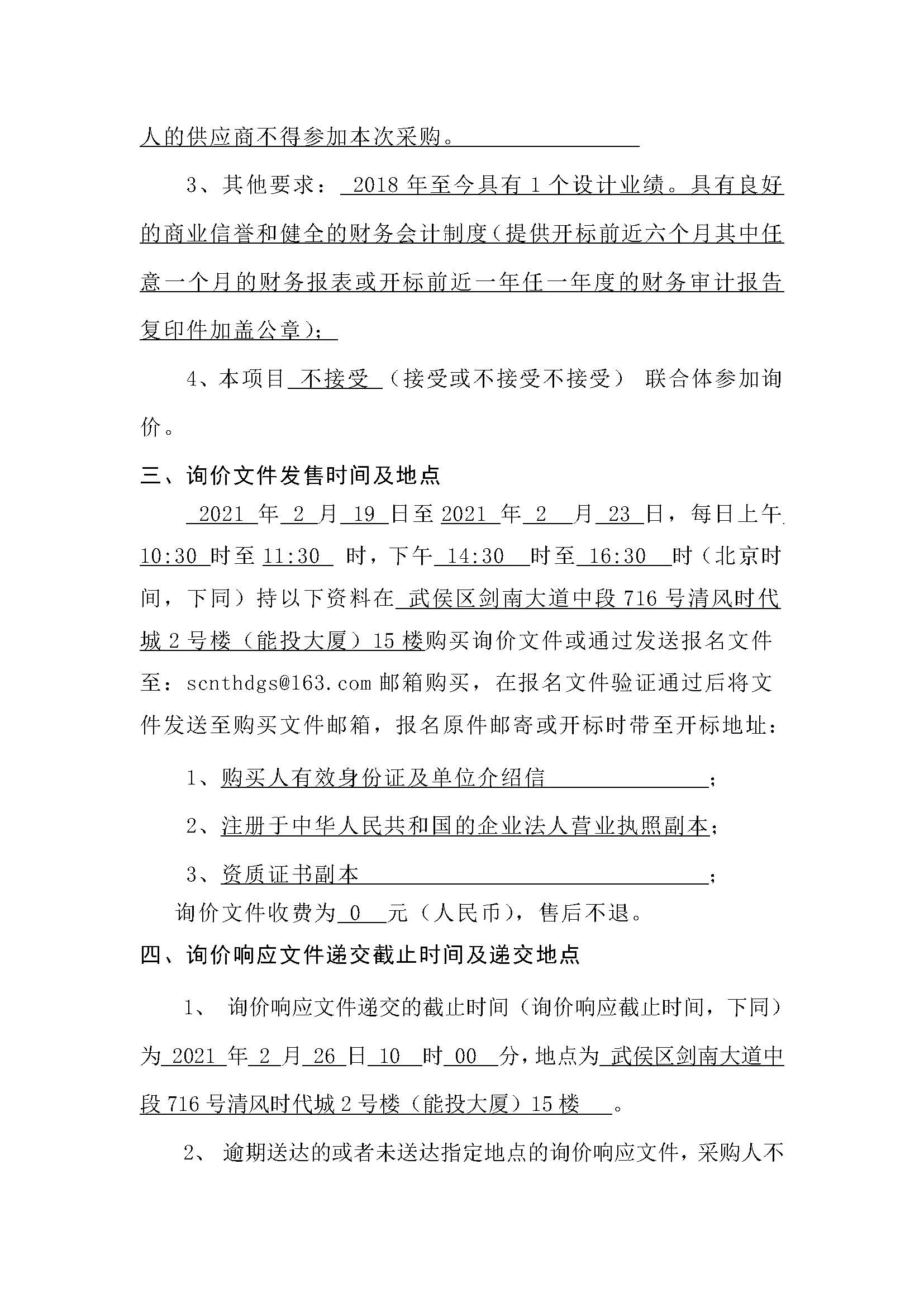 2021 年 2 月 19 日至2021 年 2 月 23 日,每日上午 10:30 时至11:30 时,下午 14:30 时至 16:30 时(北京时间,下同)持以下资料在 武侯区剑南大道中段716号清风时代城2号楼(能投大厦)15楼购买询价文件或通过发送报名文件至:[email protected]邮箱购买,在报名文件验证通过后将文件发送至购买文件邮箱,报名原件邮寄或开标时带至开标地址: