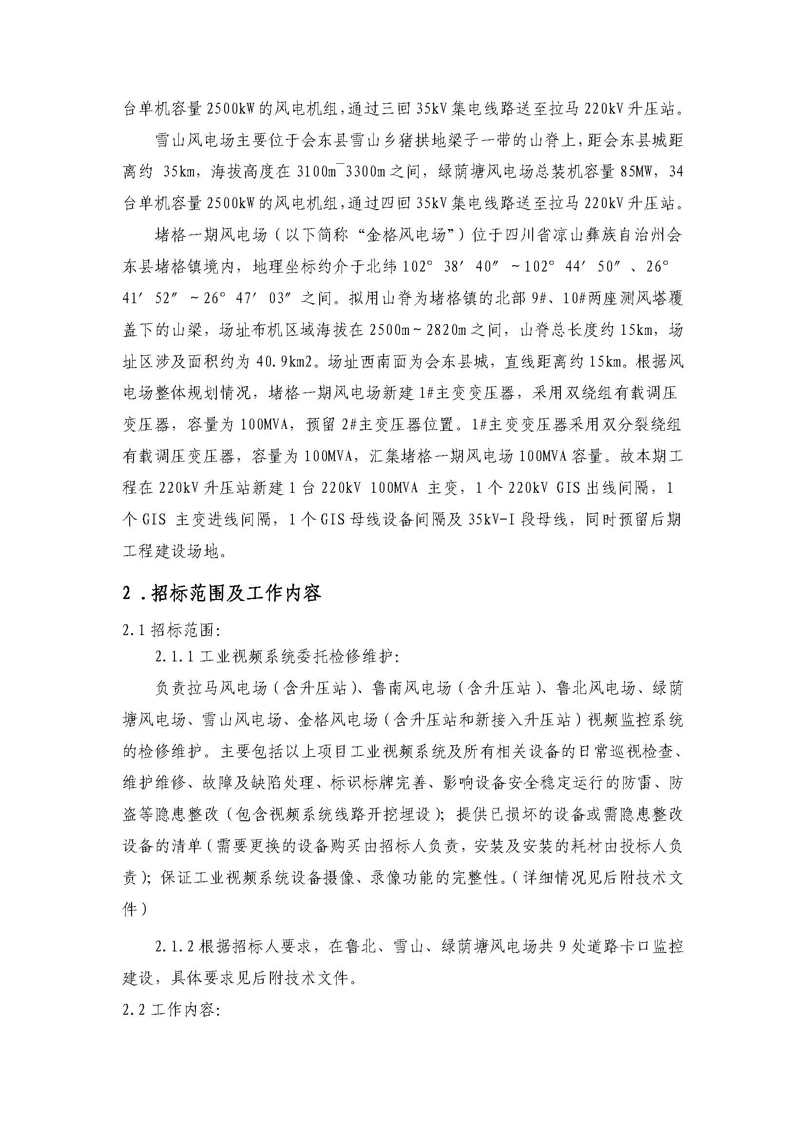 负责拉马风电场(含升压站)、鲁南风电场(含升压站)、鲁北风电场、绿荫塘风电场、雪山风电场、金格风电场(含升压站和新接入升压站)视频监控系统的检修维护。主要包括以上项目工业视频系统及所有相关设备的日常巡视检查、维护维修、故障及缺陷处理、标识标牌完善、影响设备安全稳定运行的防雷、防盗等隐患整改(包含视频系统线路开挖埋设);提供已损坏的设备或需隐患整改设备的清单(需要更换的设备购买由招标人负责,安装及安装的耗材由投标人负责);保证工业视频系统设备摄像、录像功能的完整性。(详细情况见后附技术文件)