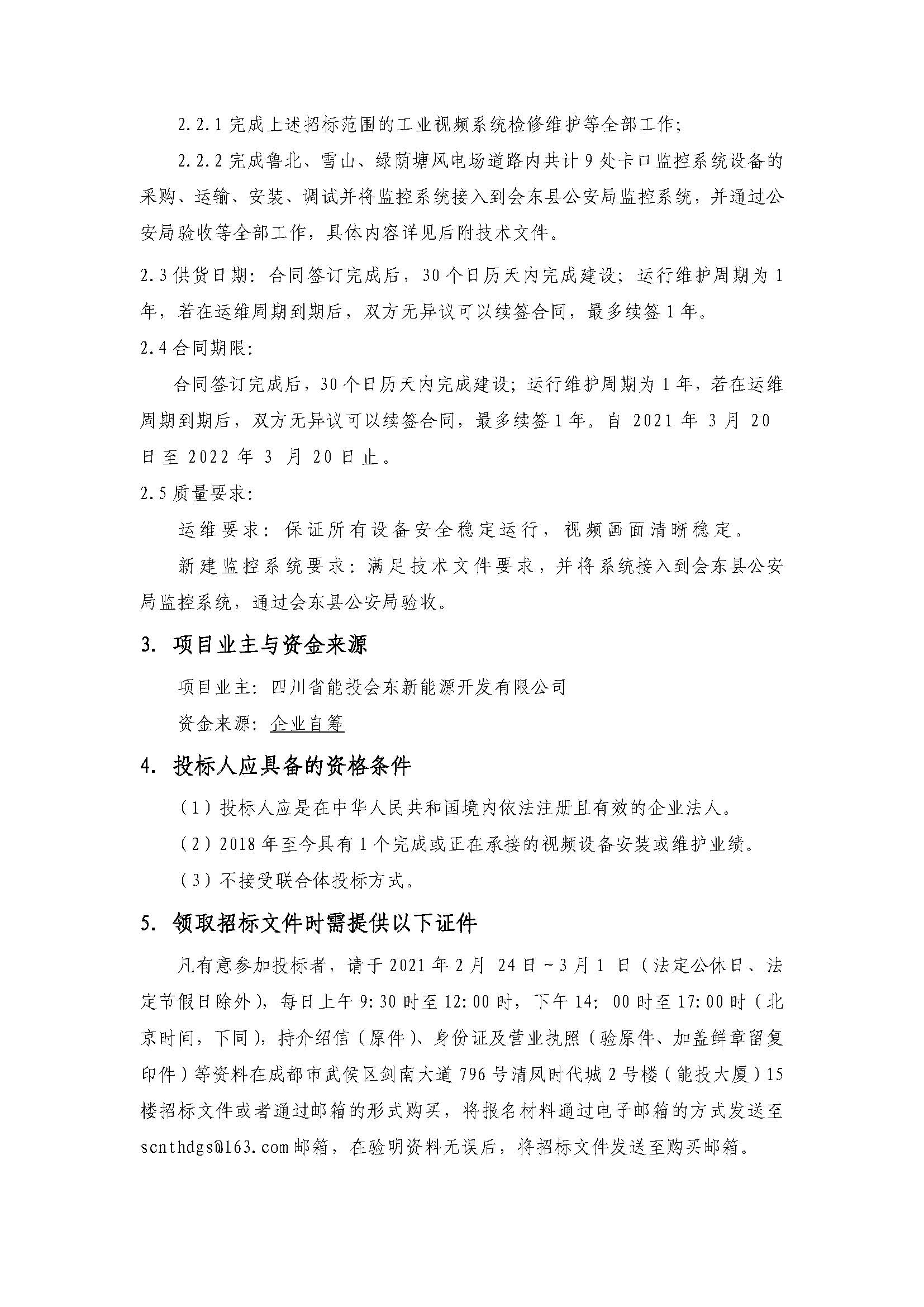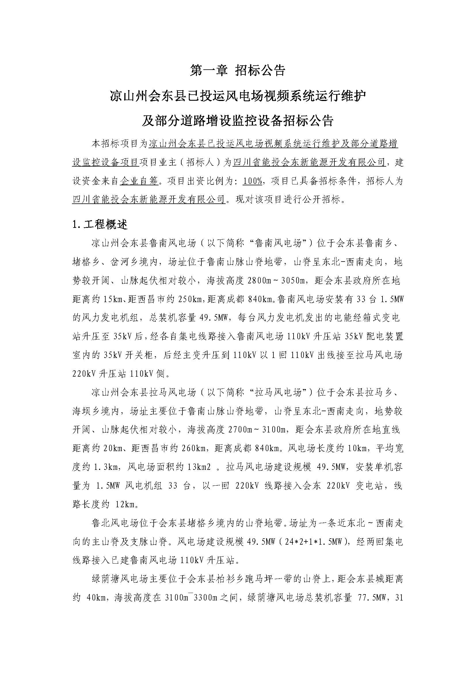 本招标项目为凉山州会东县已投运风电场视频系统运行维护及部分道路增设监控设备项目项目业主(招标人)为四川省能投会东新能源开发有限公司,建设资金来自企业自筹。项目出资比例为:100%,项目已具备招标条件,招标人为四川省能投会东新能源开发有限公司。现对该项目进行公开招标。