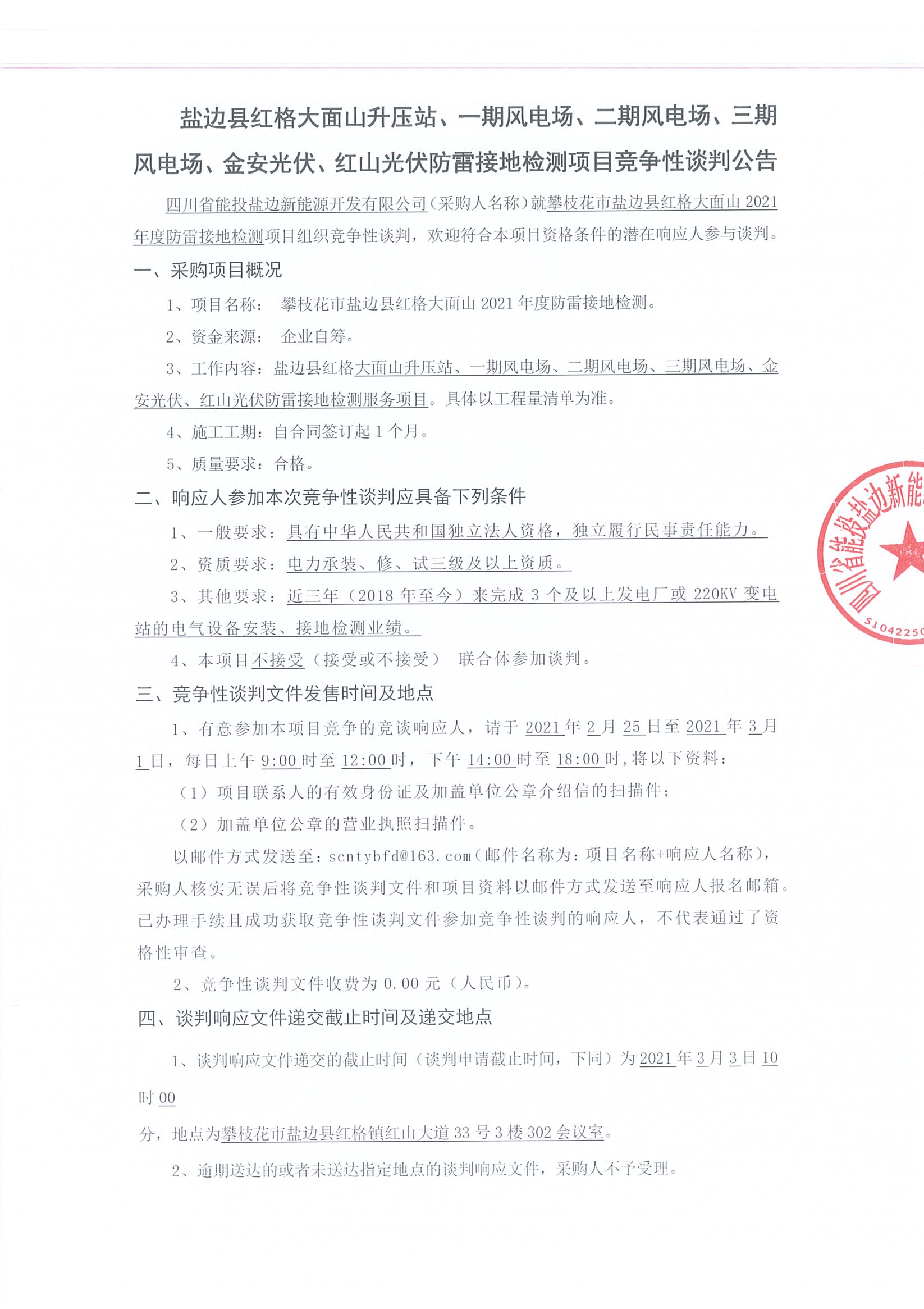 四川省能投盐边新能源开发有限公司(采购人名称)就攀枝花市盐边县红格大面山2021年度防雷接地检测项目组织竞争性谈判,欢迎符合本项目资格条件的潜在响应人参与谈判。