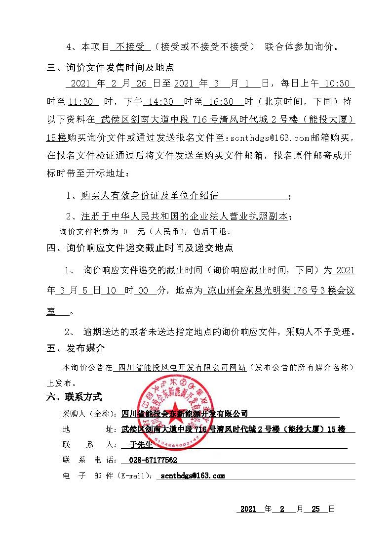 2021 年 2 月 26 日至2021 年 3 月 1 日,每日上午 10:30 时至11:30 时,下午 14:30 时至 16:30 时(北京时间,下同)持以下资料在 武侯区剑南大道中段716号清风时代城2号楼(能投大厦)15楼购买询价文件或通过发送报名文件至:[email protected]邮箱购买,在报名文件验证通过后将文件发送至购买文件邮箱,报名原件邮寄或开标时带至开标地址: