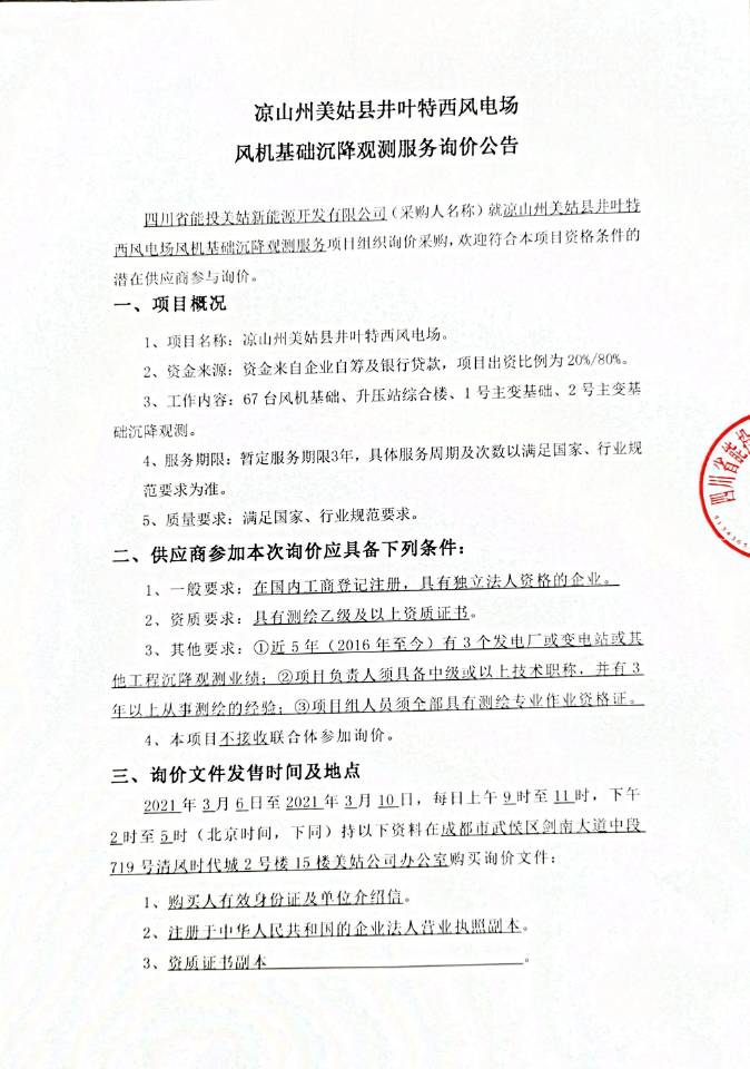 四川省能投美姑新能源开发有限公司(采购人名称)就凉山州美姑县井叶特西风电场风机基础沉降观测服务项目组织询价采购,欢迎符合本项目资格条件的潜在供应商参与询价。