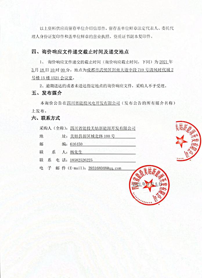 2021年3月6日至2021年3月10日,每日上午9时至11时,下午2时至5时(北京时间,下同)持以下资料在成都市武侯区剑南大道中段719号清凤时代城2号楼15楼美姑公司办公室购买询价文件: