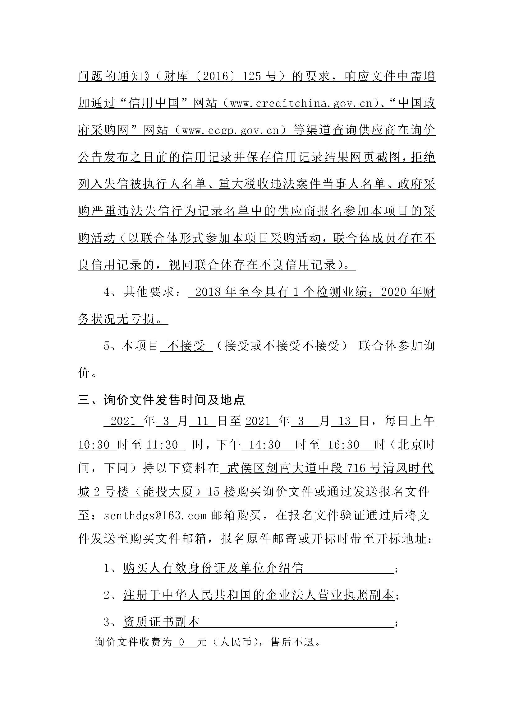 2021 年 3 月 11 日至2021 年 3 月 13 日,每日上午 10:30 时至11:30 时,下午 14:30 时至 16:30 时(北京时间,下同)持以下资料在 武侯区剑南大道中段716号清风时代城2号楼(能投大厦)15楼购买询价文件或通过发送报名文件至:[email protected]邮箱购买,在报名文件验证通过后将文件发送至购买文件邮箱,报名原件邮寄或开标时带至开标地址: