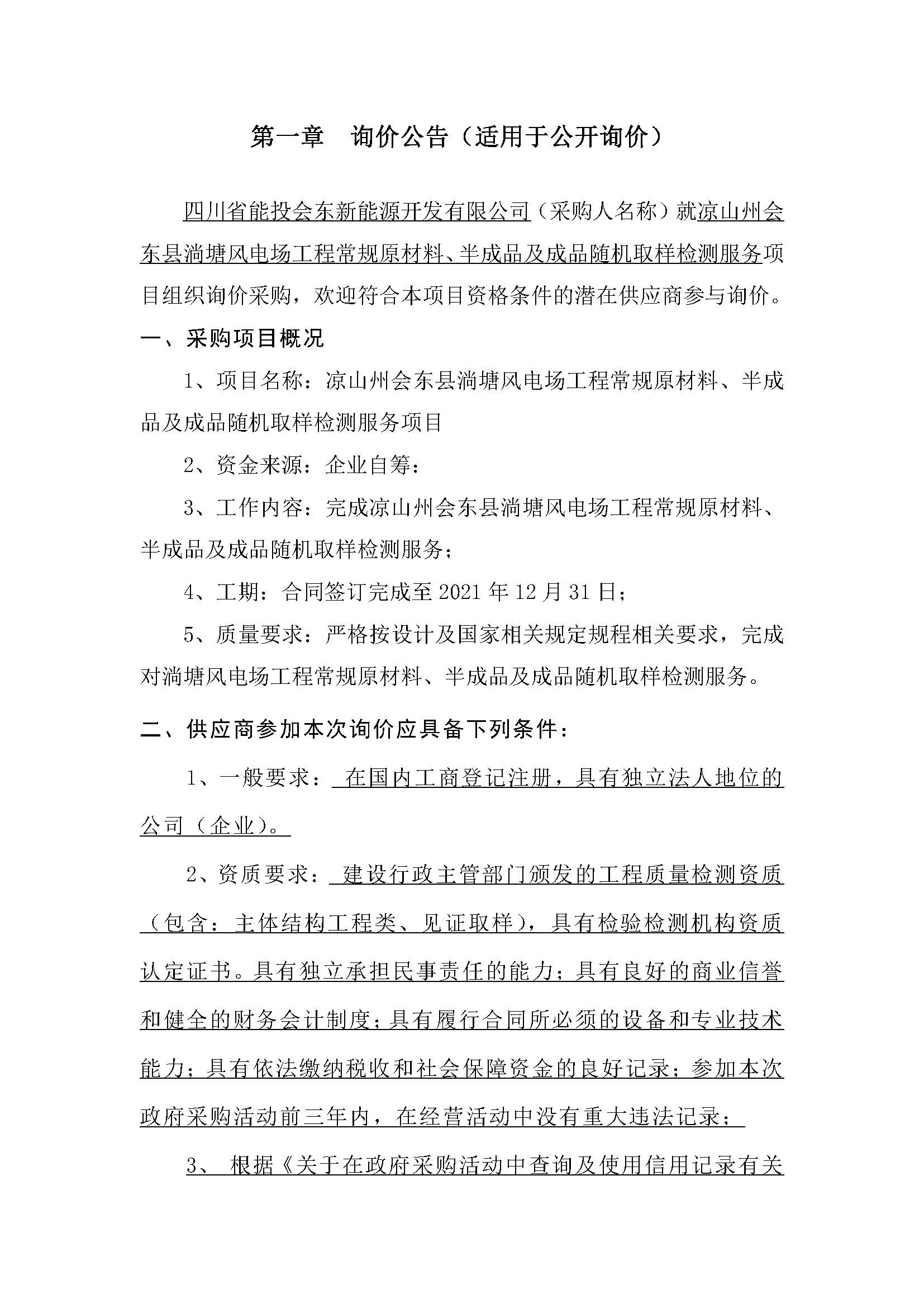 四川省能投会东新能源开发有限公司(采购人名称)就凉山州会东县淌塘风电场工程常规原材料、半成品及成品随机取样检测服务项目组织询价采购,欢迎符合本项目资格条件的潜在供应商参与询价。