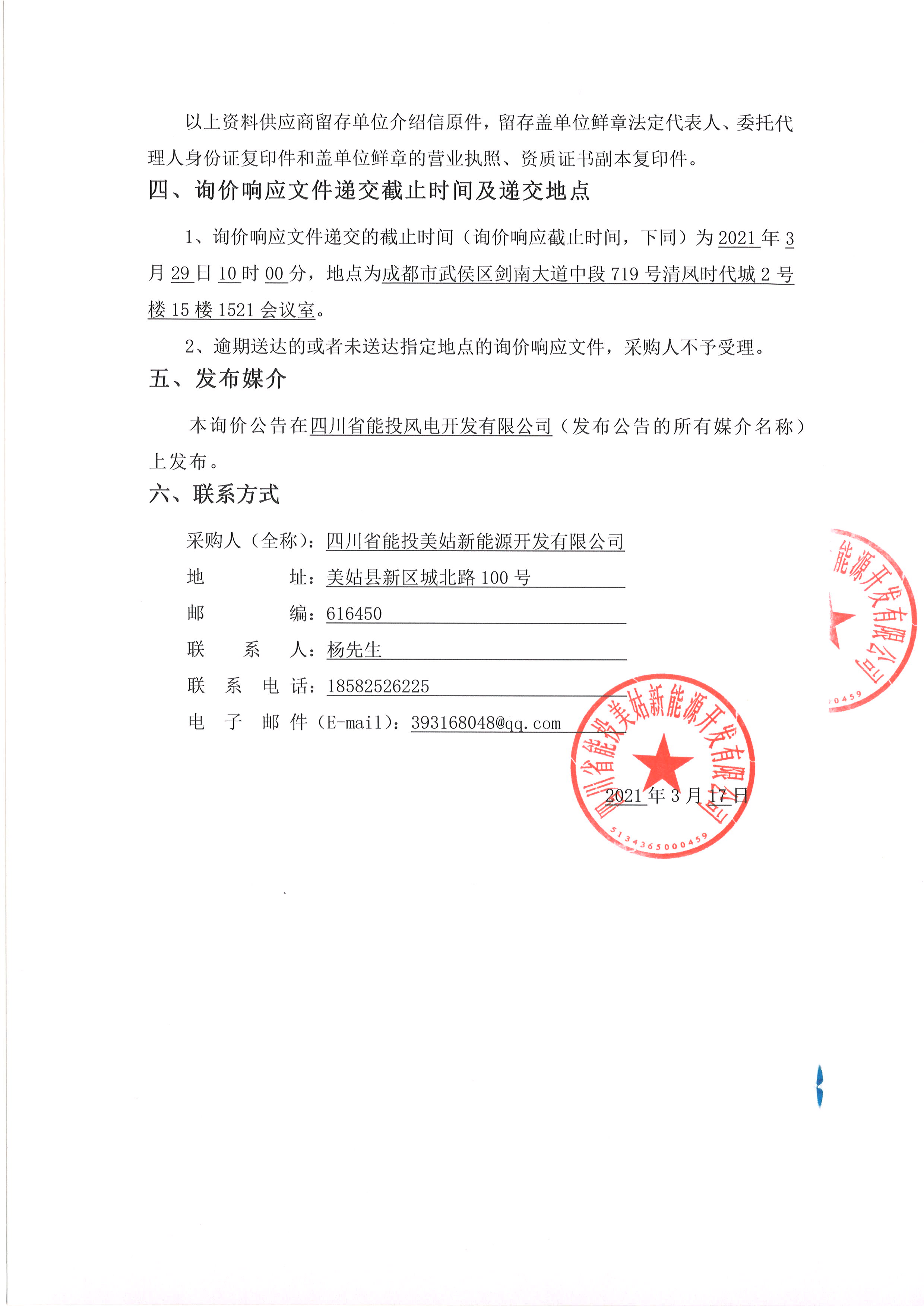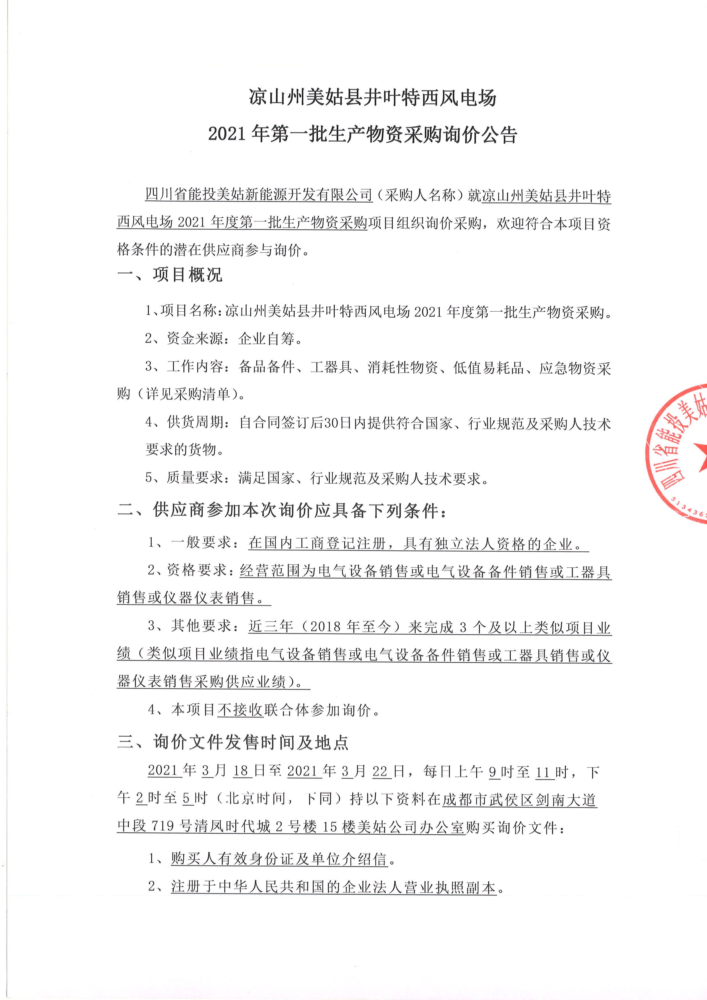 四川省能投美姑新能源开发有限公司(采购人名称)就凉山州美姑县井叶特西风电场2021年度第一批生产物资采购项目组织询价采购,欢迎符合本项目资格条件的潜在供应商参与询价。