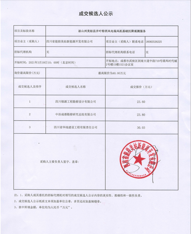凉山州美姑县井叶特西风电场风机基础沉降观测服务项目成交候选人公示