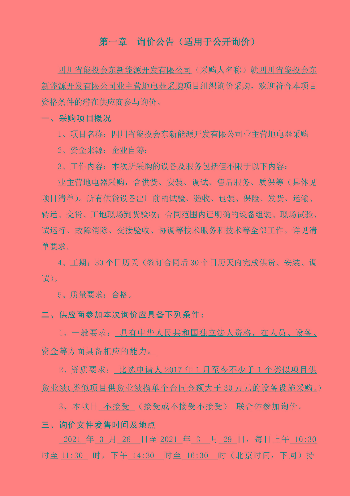四川省能投会东新能源开发有限公司(采购人名称)就四川省能投会东新能源开发有限公司业主营地电器采购项目组织询价采购,欢迎符合本项目资格条件的潜在供应商参与询价。