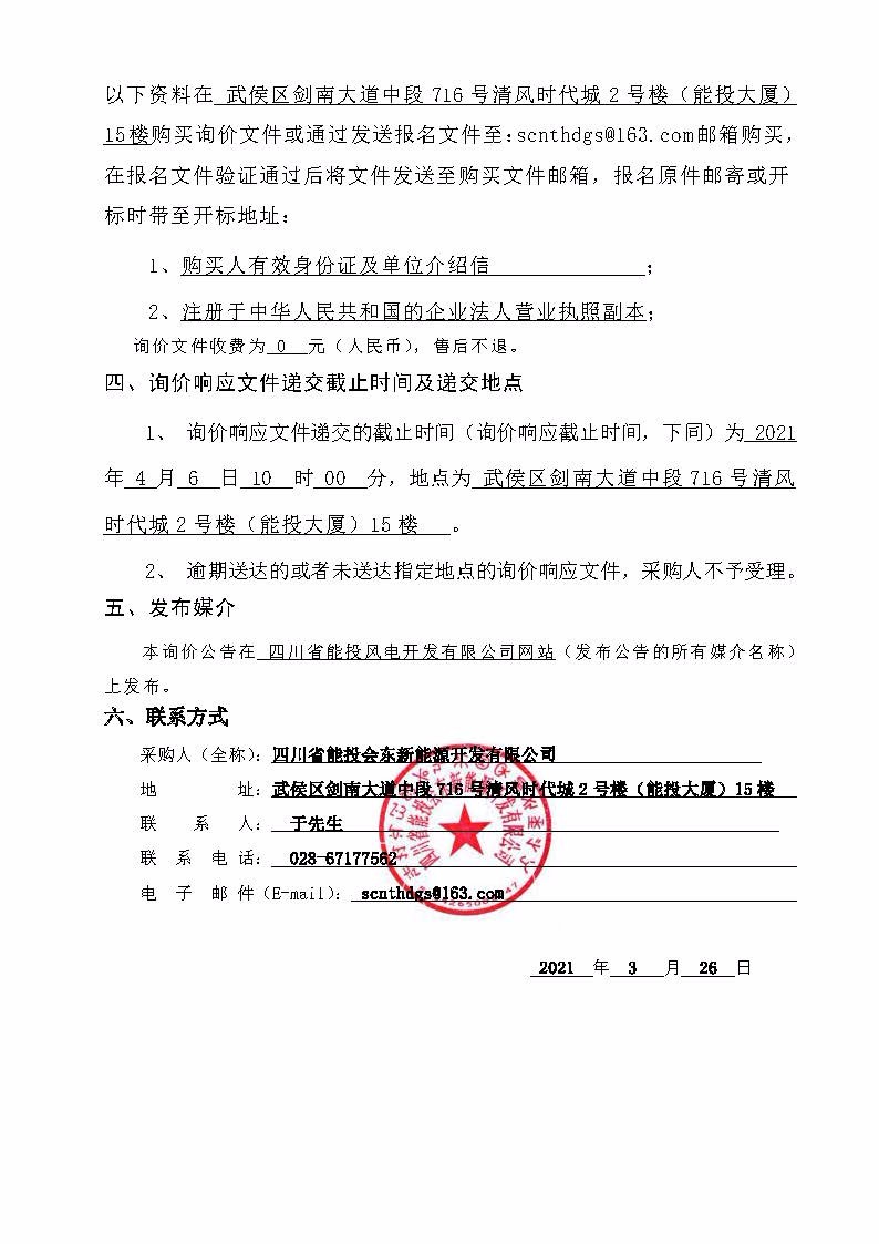 2021 年 3 月 26 日至2021 年 3 月 29 日,每日上午 10:30 时至11:30 时,下午 14:30 时至 16:30 时(北京时间,下同)持以下资料在 武侯区剑南大道中段716号清风时代城2号楼(能投大厦)15楼购买询价文件或通过发送报名文件至:[email protected]邮箱购买,在报名文件验证通过后将文件发送至购买文件邮箱,报名原件邮寄或开标时带至开标地址: