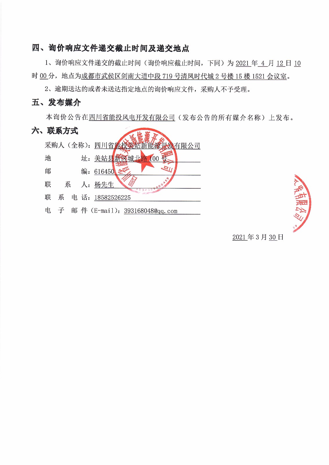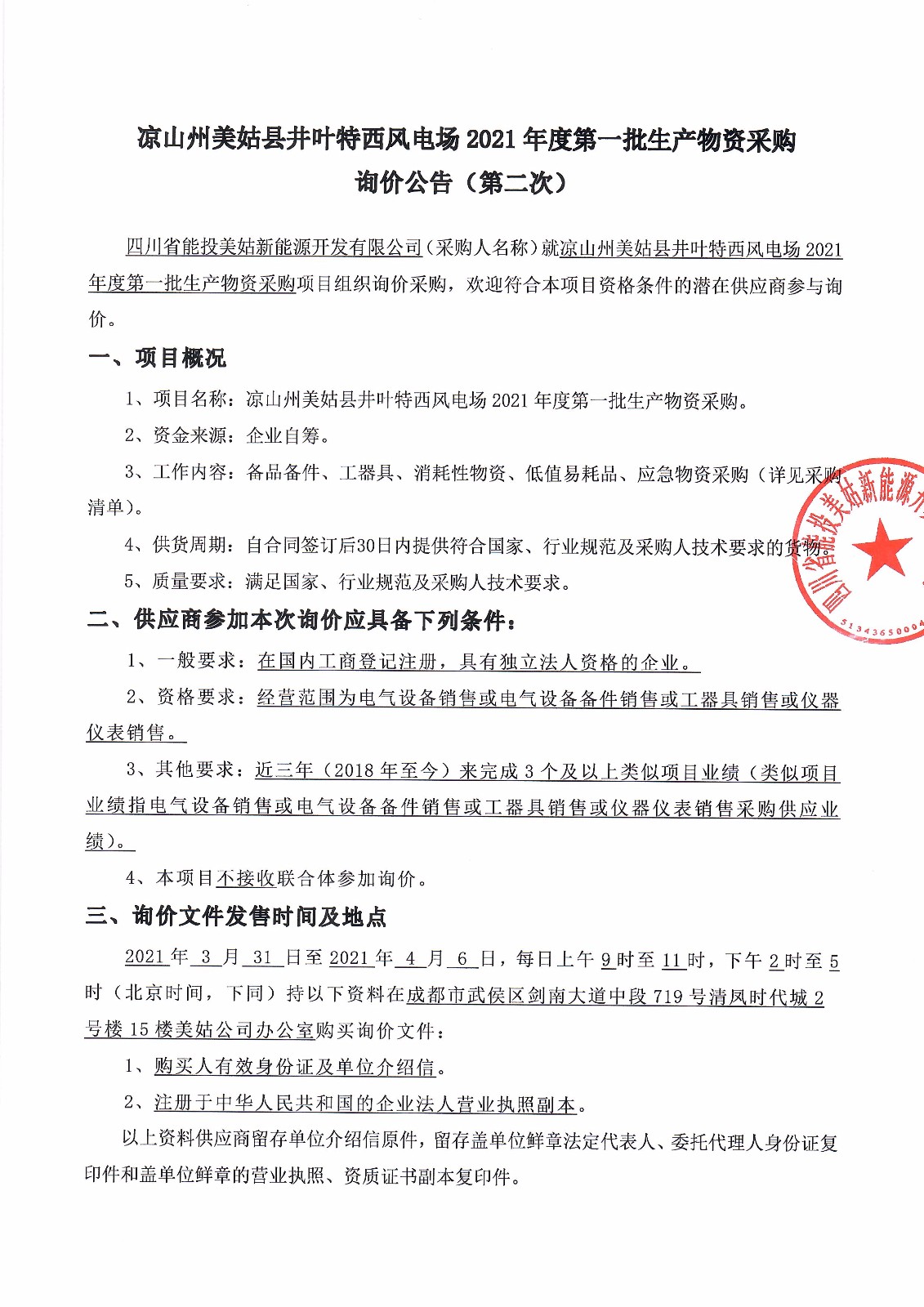 四川省能投美姑新能源开发有限公司(采购人名称)就凉山州美姑县井叶特西风电场2021年度第一批生产物资采购项目组织询价采购,欢迎符合本项目资格条件的潜在供应商参与询价。