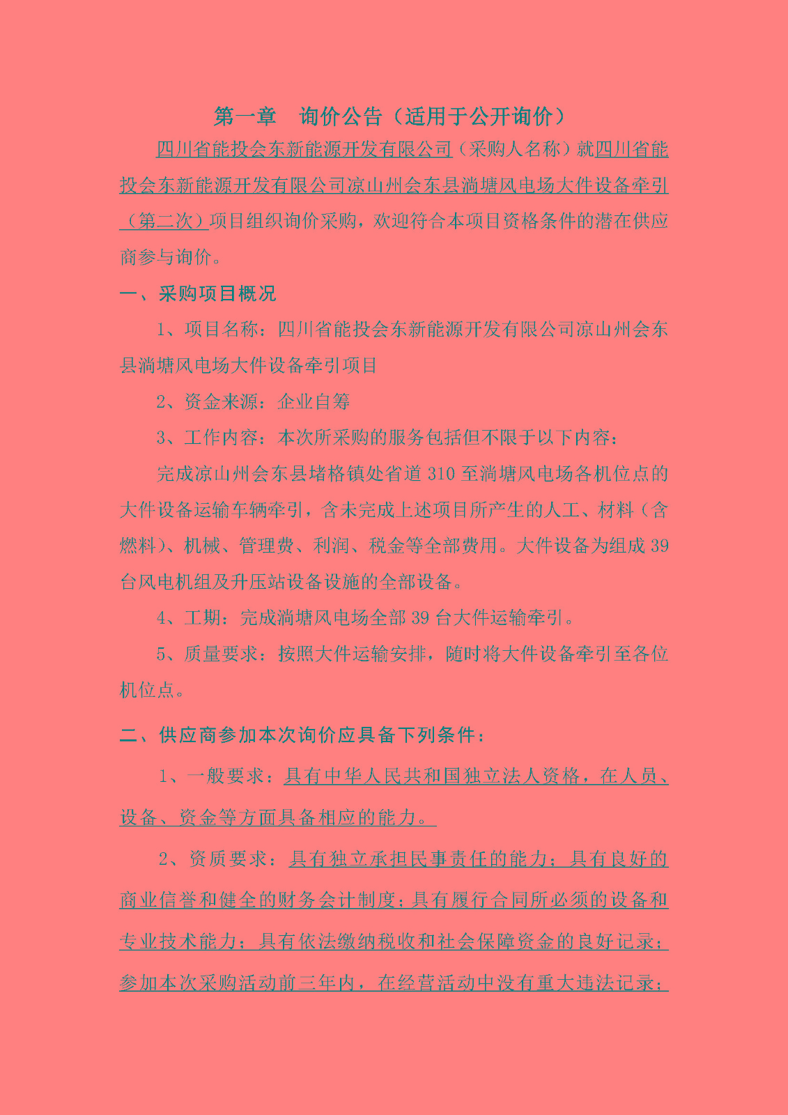 四川省能投会东新能源开发有限公司(采购人名称)就四川省能投会东新能源开发有限公司凉山州会东县淌塘风电场大件设备牵引(第二次)项目组织询价采购,欢迎符合本项目资格条件的潜在供应商参与询价。