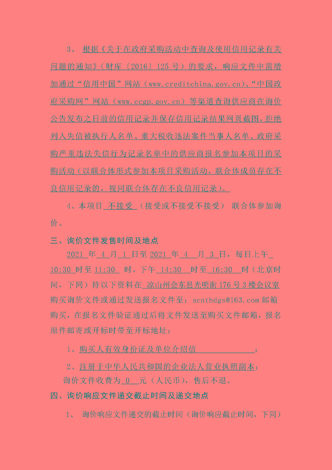 2021 年 4 月 1 日至2021 年 4 月 3 日,每日上午 10:30 时至11:30 时,下午 14:30 时至 16:30 时(北京时间,下同)持以下资料在 凉山州会东县光明街176号3楼会议室购买询价文件或通过发送报名文件至:[email protected]邮箱购买,在报名文件验证通过后将文件发送至购买文件邮箱,报名原件邮寄或开标时带至开标地址: