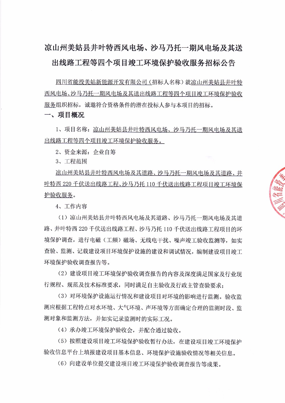 四川省能投美姑新能源开发有限公司(招标人名称)就凉山州美姑县井叶特西风电场、沙马乃托一期风电场及其送出线路工程等四个项目竣工环境保护验收服务组织招标,诚邀符合资格条件的潜在投标人参与本项目的招标。