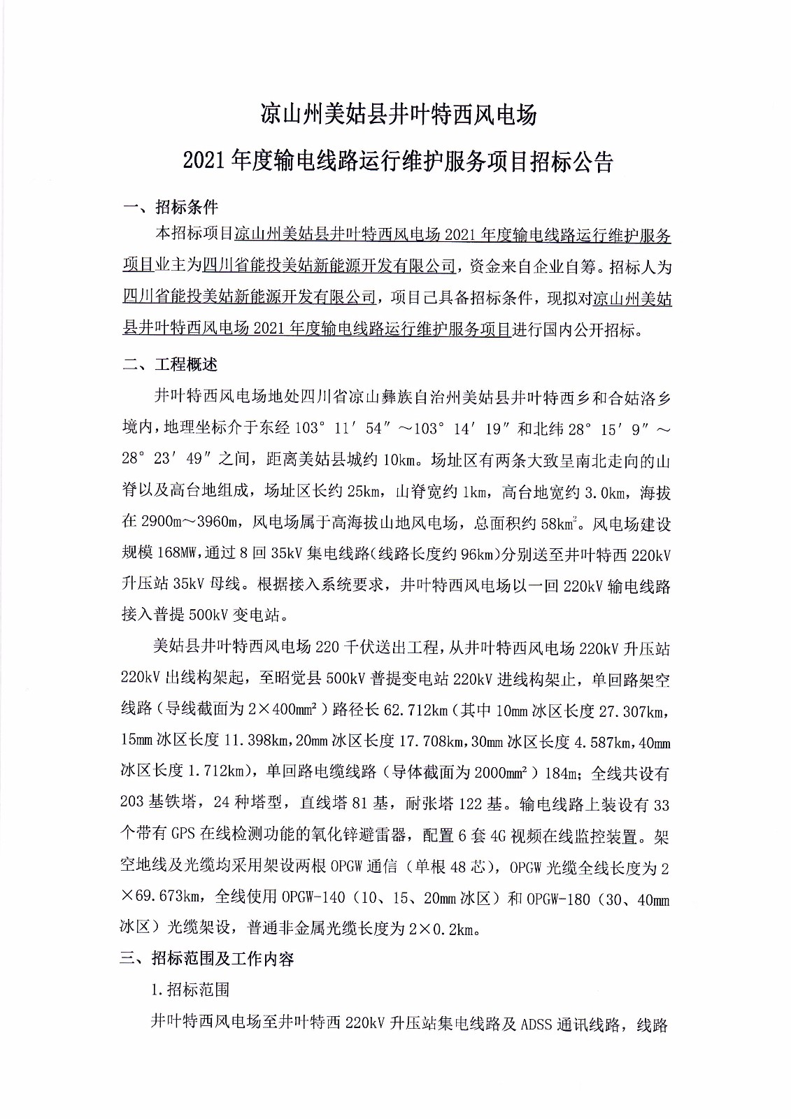 本招标项目凉山州美姑县井叶特西风电场2021年度输电线路运行维护服务项目业主为四川省能投美姑新能源开发有限公司,资金来自企业自筹。招标人为四川省能投美姑新能源开发有限公司,项目己具备招标条件,现拟对凉山州美姑县井叶特西风电场2021年度输电线路运行维护服务项目进行国内公开招标。