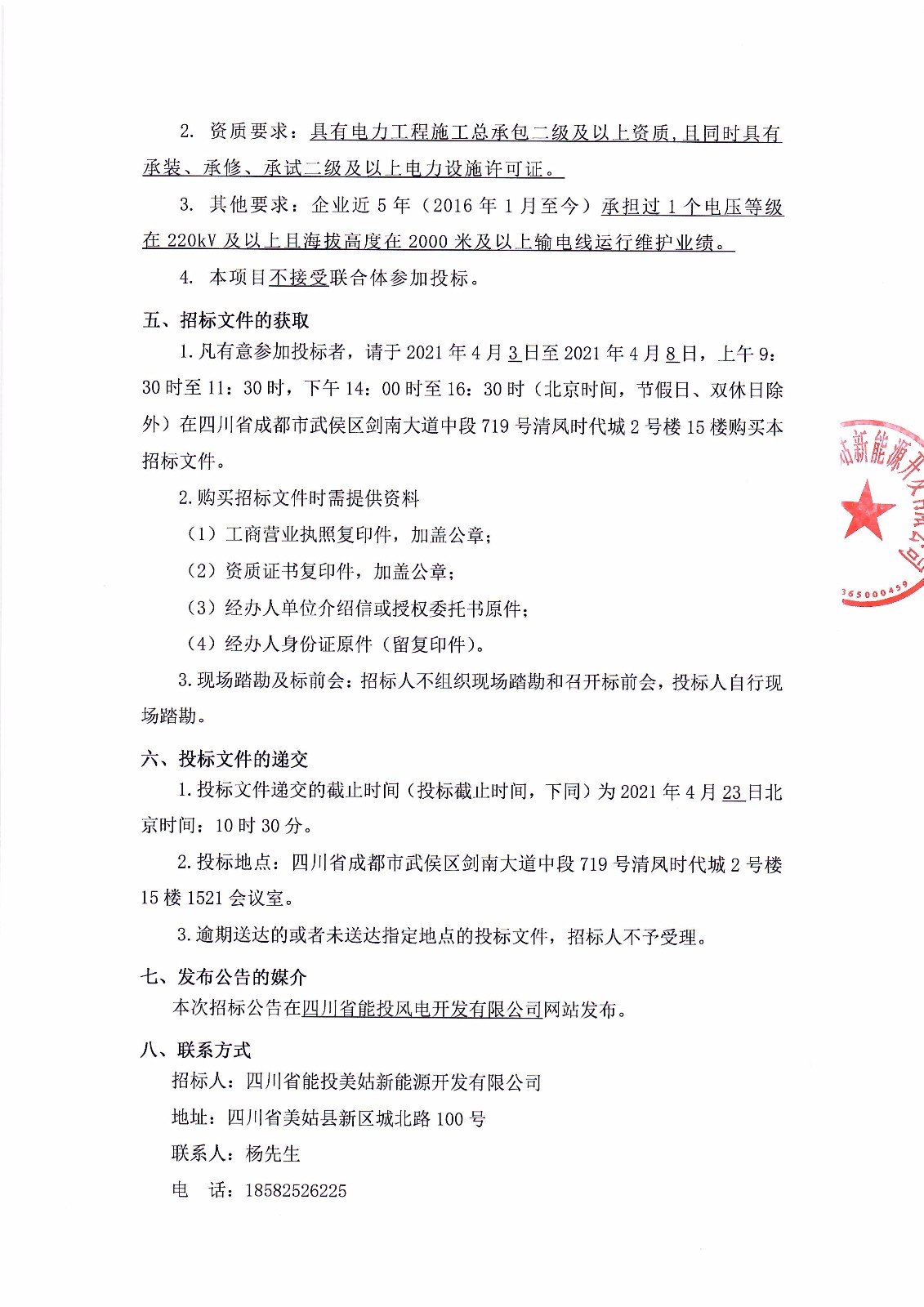 2. 资质要求:具有电力工程施工总承包二级及以上资质,且同时具有承装、承修、承试二级及以上电力设施许可证。
