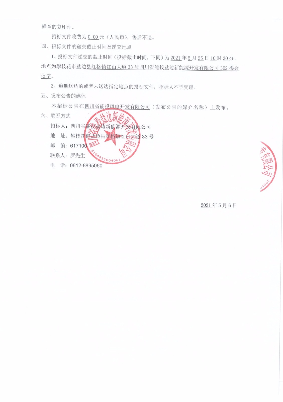 请有意参加本项目竞争的投标人,请于2021年5月6日至2021年5月12日,每日上午9:00时至12:00 时,下午14:00时至17:00时(北京时间,下同)持以下资料在攀枝花市盐边县红格镇红山大道33号四川省能投盐边新能源开发有限公司305办公室购买招标文件: