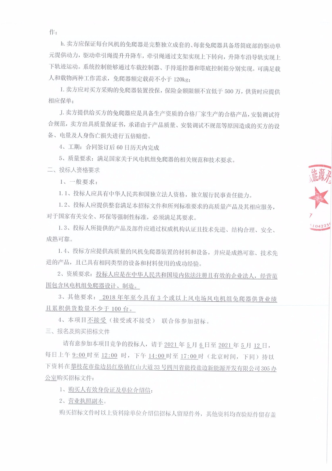 四川省能投盐边新能源开发有限公司(招标人名称)就盐边县红格大面山二期风电场50台风机增设免爬器项目组织招标,诚邀符合资格条件的潜在投标人参与本项目的招标。