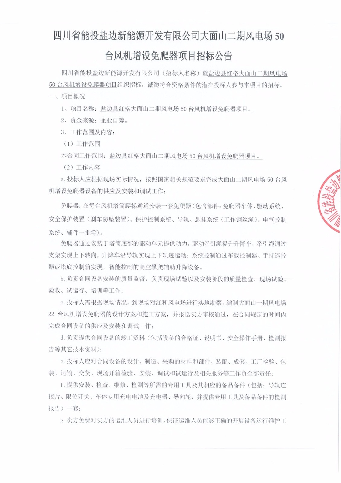1、项目名称:盐边县红格大面山二期风电场50台风机增设免爬器项目。