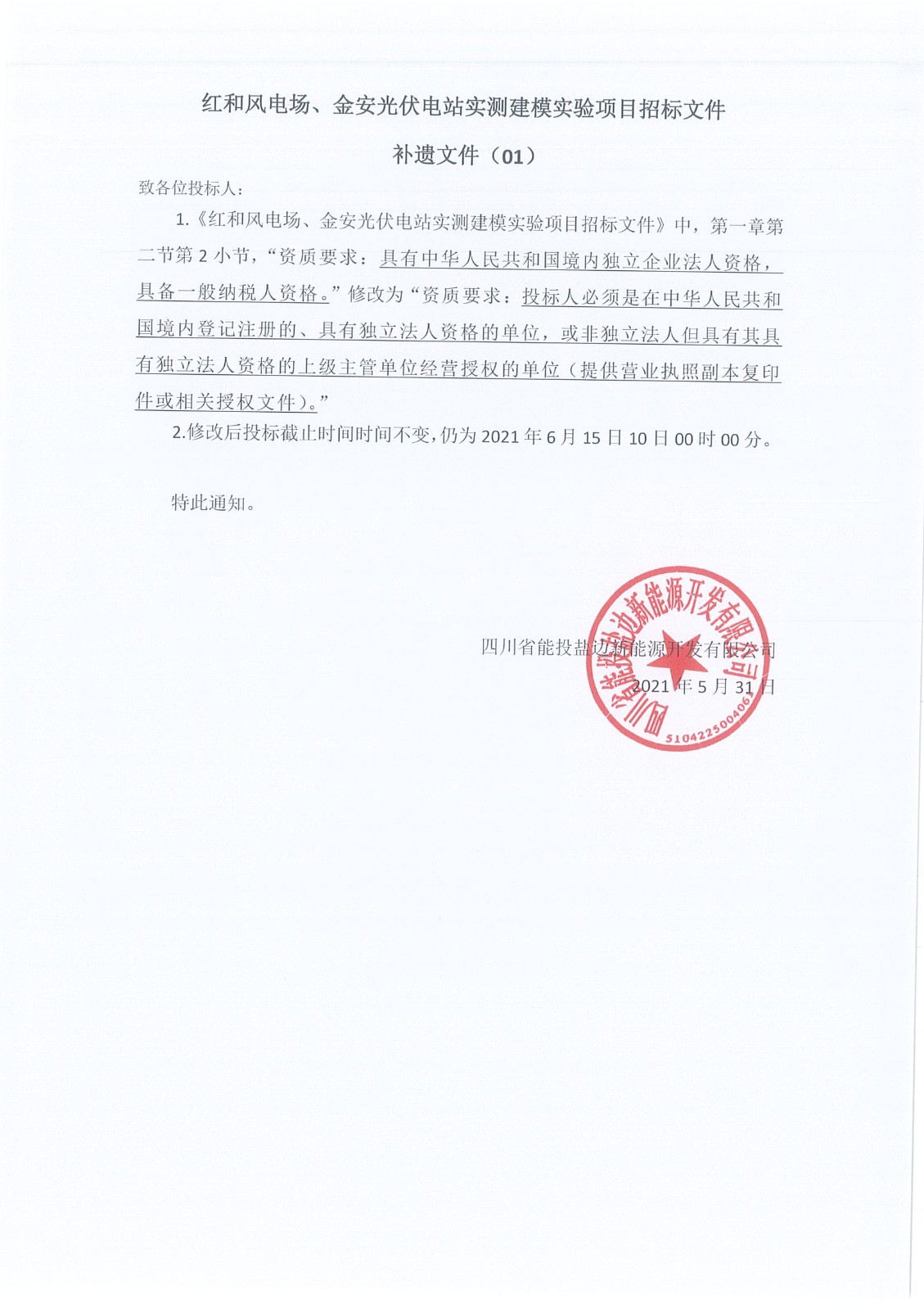 1.《红和风电场、金安光伏电站实测建模实验项目招标文件》中,第一章第二节第2小节,“资质要求:具有中华人民共和国境内独立企业法人资格,具备一般纳税人资格。”修改为“资质要求:投标人必须是在中华人民共和国境内登记注册的、具有独立法人资格的单位,或非独立法人但具有其具有独立法人资格的上级主管单位经营授权的单位(提供营业执照副本复印件或相关授权文件)。”