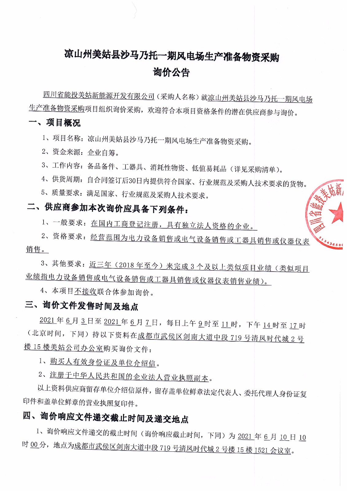 四川省能投美姑新能源开发有限公司(采购人名称)就凉山州美姑县沙马乃托一期风电场生产准备物资采购项目组织询价采购,欢迎符合本项目资格条件的潜在供应商参与询价。