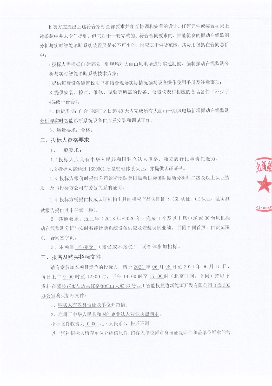 四川省能投盐边新能源开发有限公司(招标人名称)就大面山一期风电场新增振动在线监测分析与实时智能诊断系统(第二次)项目组织招标,诚邀符合资格条件的潜在投标人参与本项目的招标。