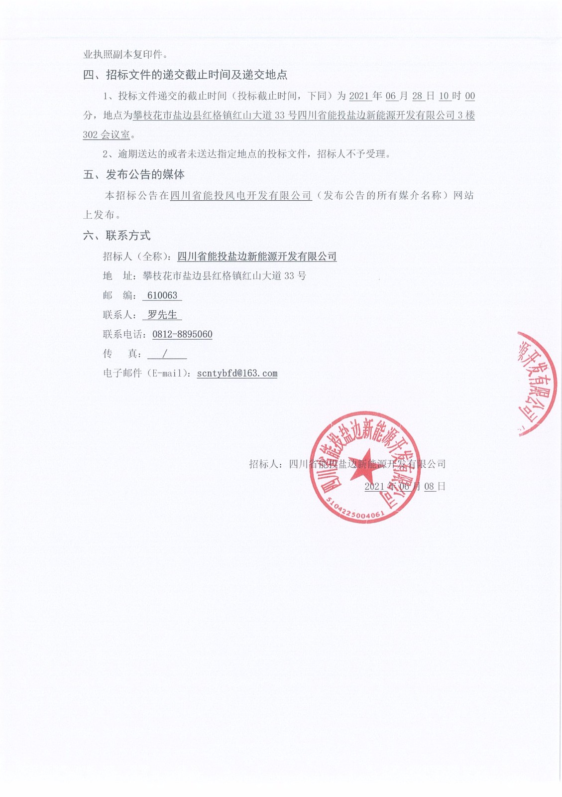1、投标文件递交的截止时间(投标截止时间,下同)为2021年06月28日10时00分,地点为攀枝花市盐边县红格镇红山大道33号四川省能投盐边新能源开发有限公司3楼302会议室。