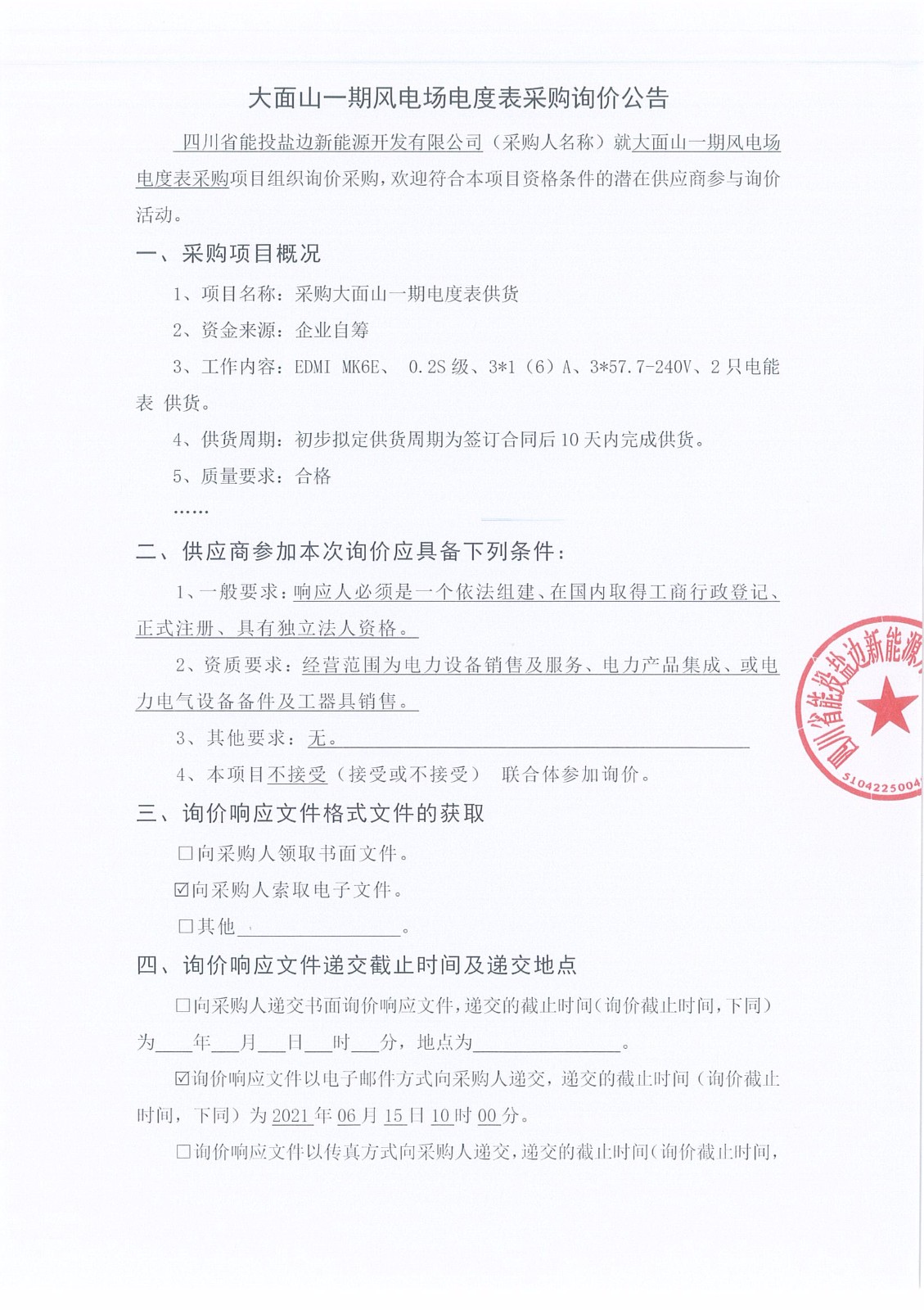 四川省能投盐边新能源开发有限公司(采购人名称)就大面山一期风电场电度表采购项目组织询价采购,欢迎符合本项目资格条件的潜在供应商参与询价活动。