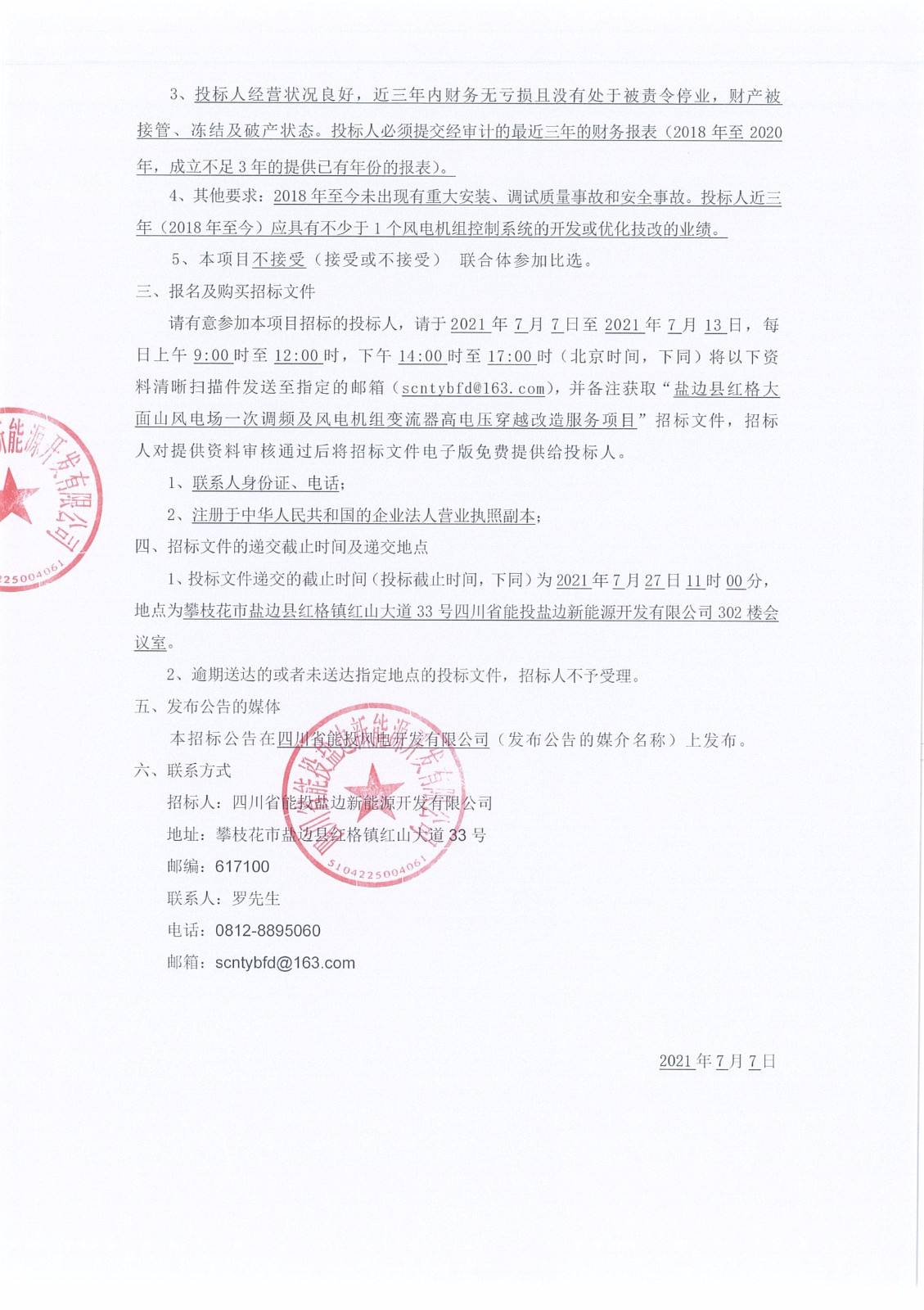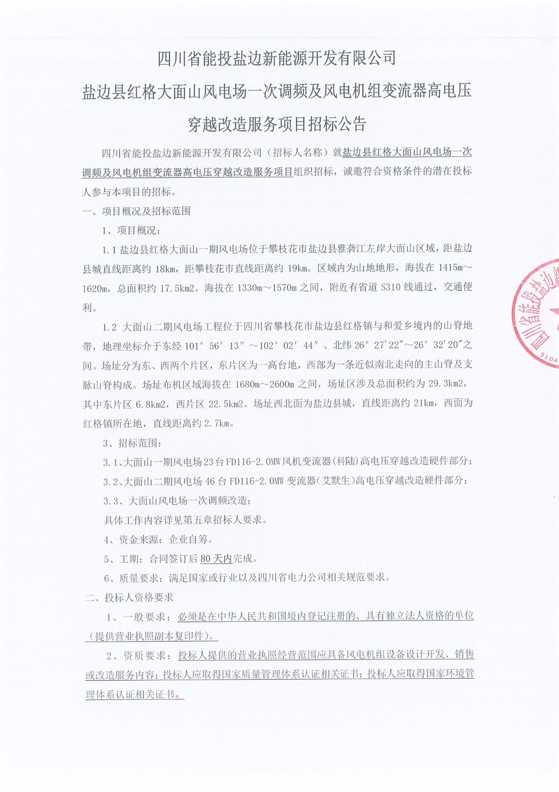 四川省能投盐边新能源开发有限公司(招标人名称)就盐边县红格大面山风电场一次调频及风电机组变流器高电压穿越改造服务项目组织招标,诚邀符合资格条件的潜在投标人参与本项目的招标。