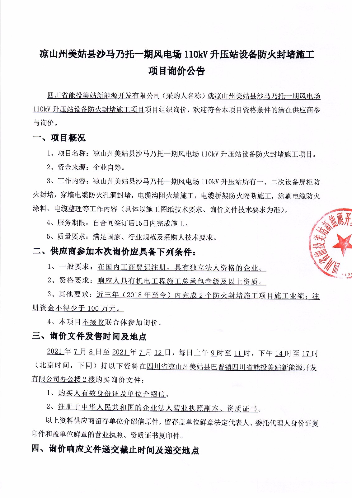 四川省能投美姑新能源开发有限公司(采购人名称)就凉山州美姑县沙马乃托一期风电场110kV升压站设备防火封堵施工项目项目组织询价,欢迎符合本项目资格条件的潜在供应商参与询价。
